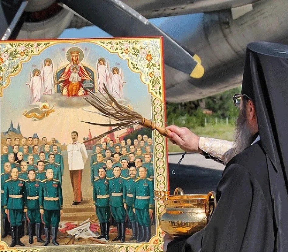 С помощью образов из прошлого типа Владимира Красно Солнышко или Александра Невского история переделывается под нужды настоящего, и сквозь лики святых начинает проступать портрет великого президента, а сквозь строки житий — программа его будущих побед. С помощью святых ХХ века РПЦ сплетает себя с (пост)советскими идолами — Великой Победы, освоения космоса, «русского мира» как нового мессианского проекта, пришедшего на место коммунизма. В самой доходчивой форме этот новый микс воплощен в росписях «Главного храма ВС РФ», где кресты соседствуют с красными звездами, серпами и молотами, а Христос, Богородица и святые благословляют Красную армию, коммунистов и «новую историческую общность» — советский народ, он же — «русский мир». Реликвии христианские и советские сливаются в этом храме воедино: в икону Иоанна Предтечи, которую кладут на аналой для целования верующими, вмонтирована лупа маршала Василевского как священная для православных реликвия.