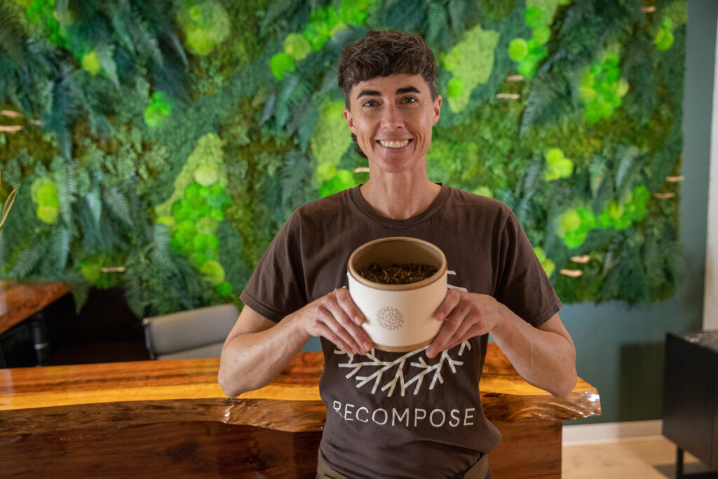Катрина Спейд держит сосуд с человеческим компостом в офисе Recompose, Сиэтл, 6 октября 2022 года. Фото: Mat Hayward / Recompose / Getty Images