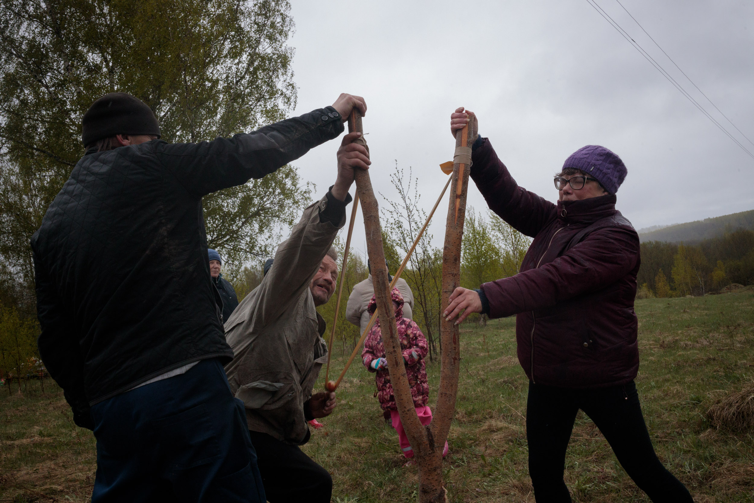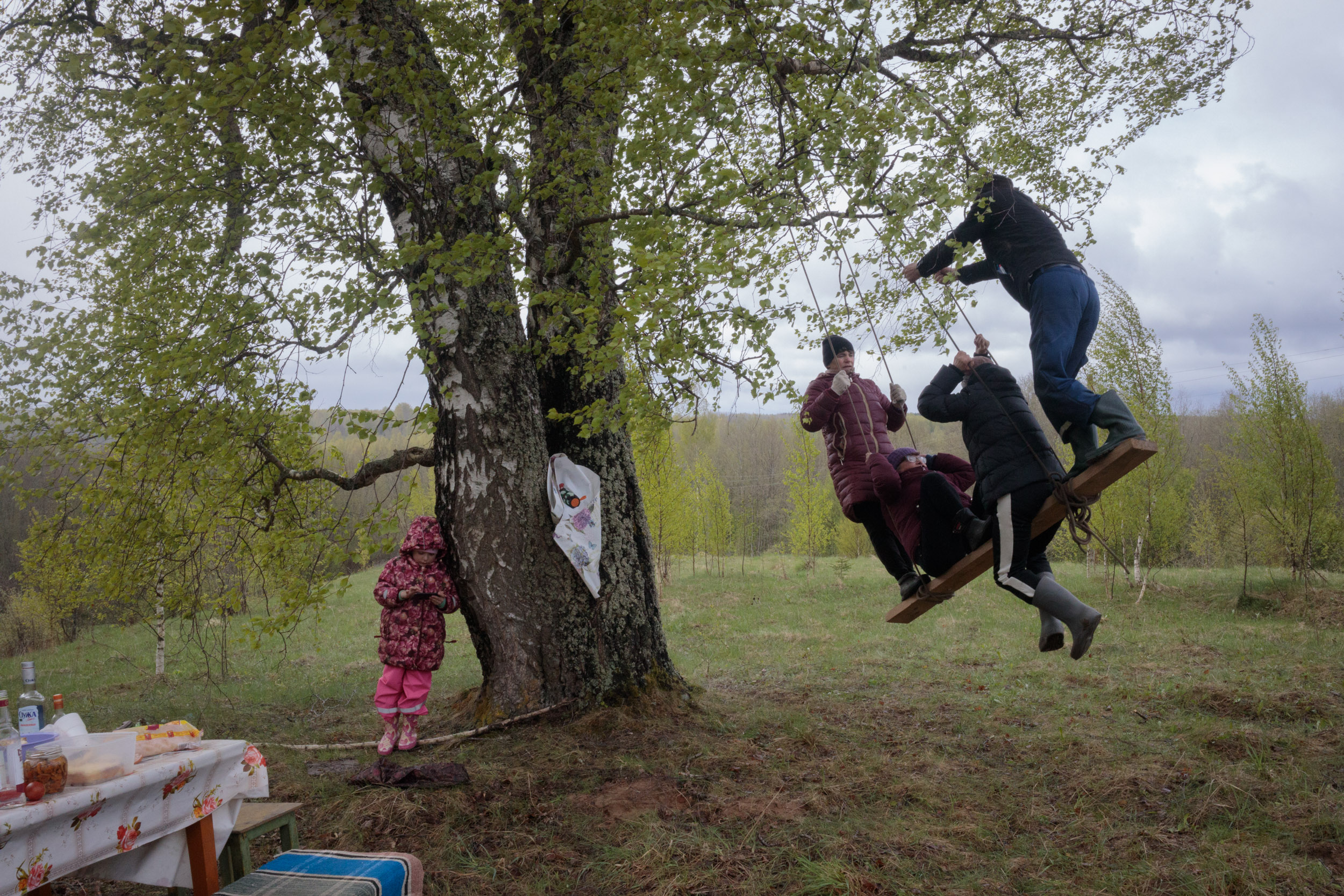 Жители деревни катаются на самодельных качелях на Пасху