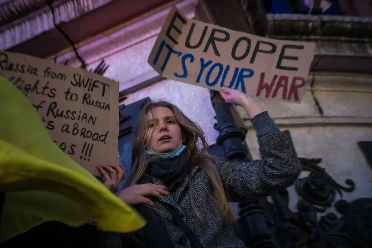 A protest against the Russian invasion of Ukraine in front of the Reichstag in Berlin, Germany, 3 March 2022. Photo: EPA-EFE / FILIP SINGER