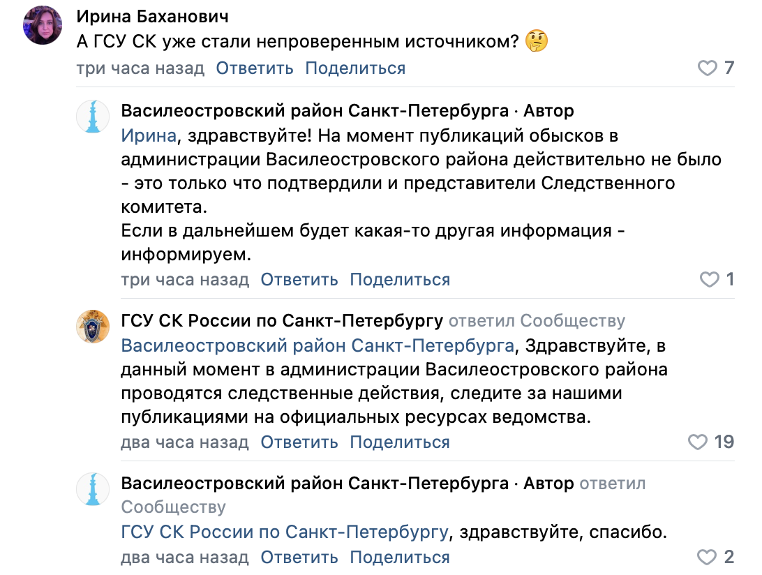 В группе Василеостровского района во «ВКонтакте» назвали это «фейком». Спустя час в комментариях с аккаунта Следственного комитета им ответили, что в администрации проводят «следственные действия», и призвали «следить за публикациями на официальных ресурсах ведомства».