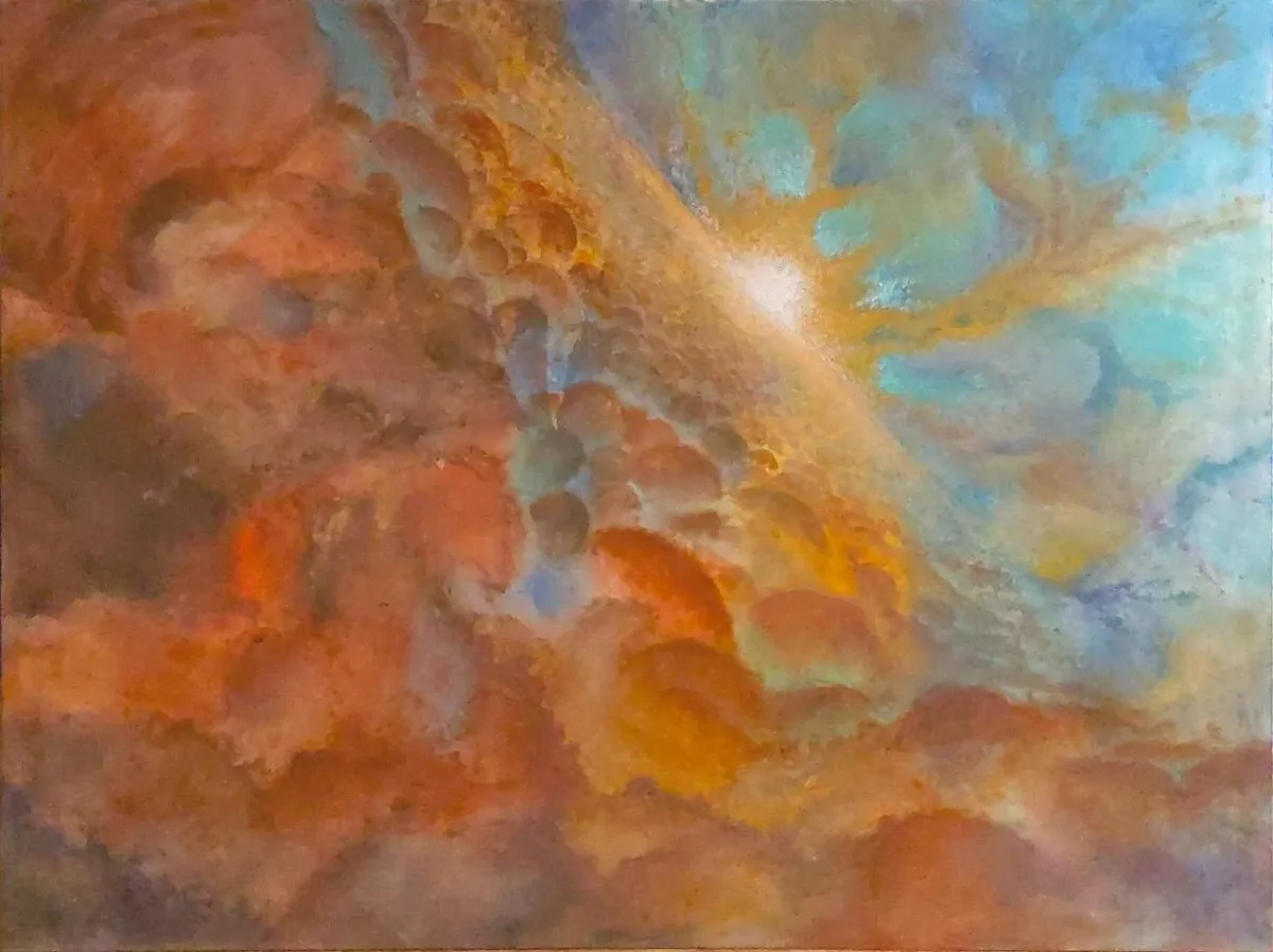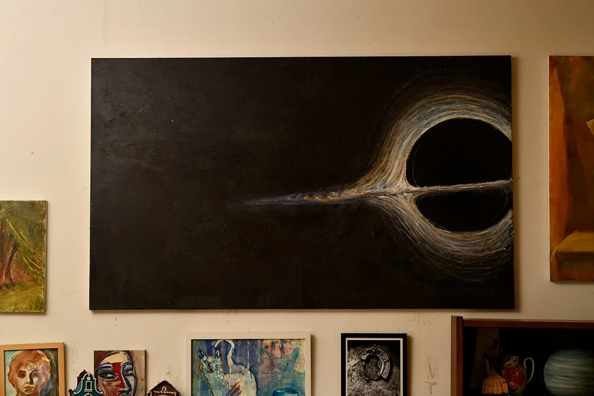 В августе мама прислала мне информацию о предстоящем конкурсе. Я узнал, что нужно нарисовать что-то на тему науки, а главный приз — айпад. Я подумал, что, если выиграю айпад, смогу его продать и отложить деньги на покупку компьютера. У нас был холст, который мама купила два года назад для другого, неудавшегося проекта, и я понял, что обстоятельства складываются в мою пользу. На самом деле я очень боялся приступать к работе, потому что после того, как год назад я завершил большую картину, мое состояние ухудшилось, и я не мог так долго стоять. Когда я первый раз после этого сел за холст, то сильно испугался, ведь нужно было три часа бить губкой, чтобы что-то получилось. Но мама помогала мне закрашивать фон, потому что я один не смог бы это сделать. Потом я уже сам начал находить какие-то образы. Сначала думал назвать картину «Белая дыра» и сделать что-то в этом духе. Я хотел изобразить что-то связанное с Большим взрывом; образы становились все более похожими на взрыв. В общем, по-моему, картина была написана за шесть дней. Каждый день я рисовал по несколько часов. Я сделал себе огромную длинную кисть: на палку намотал кисточку скотчем. Когда картина была готова, мы ее сфотографировали и отправили. Я с нетерпением начал ждать результатов. Сначала был уверен, что выиграю, потом — наоборот, думал, что проиграю. В день, когда сообщили, что я выиграл, я сидел в мастерской и работал. Новость сообщила мама по телефону. Я так обрадовался, что даже устал.