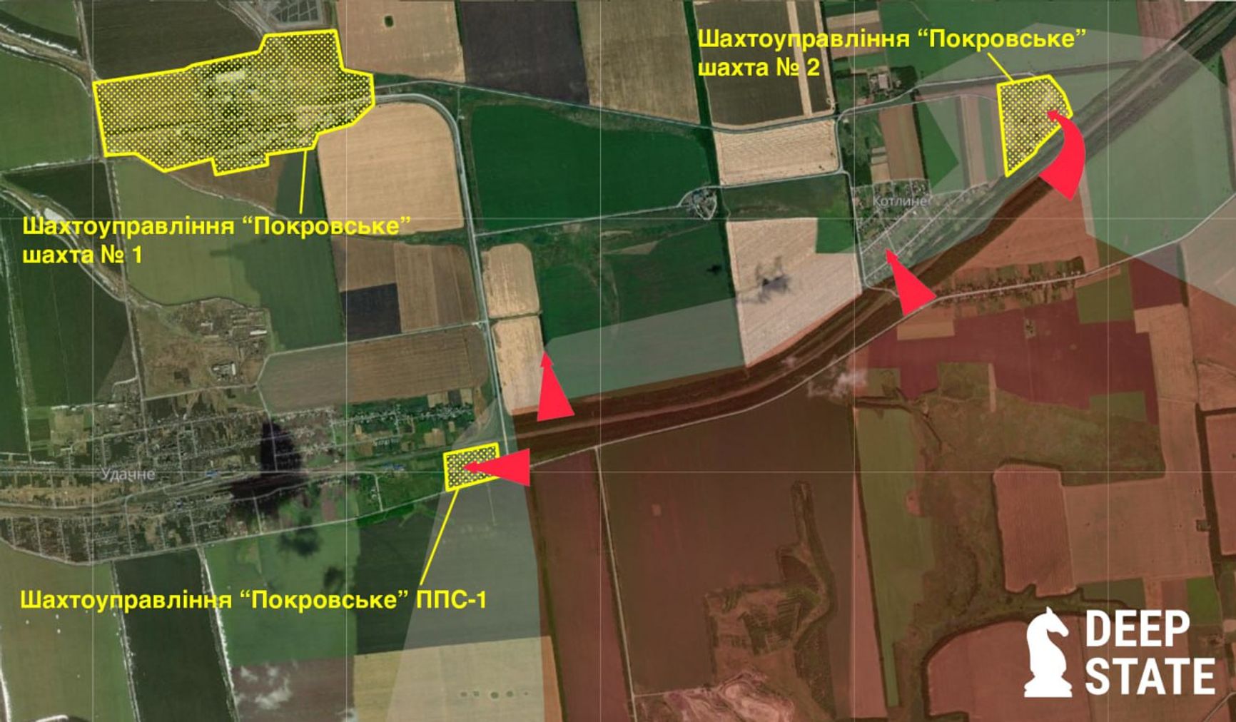 Аналитики DeepState констатируют (1, 2, 3) расширение зоны контроля ВС РФ около Удачного, Котлина (до 2016 года — Димитрово), Новоандреевки и Славянки на западном фланге сформированного под Покровском и Мирноградом (до 2016 года — Димитров) выступа. Российские атаки проводятся не только на Котлино, но и восточнее — в сторону шахтоуправления «Покровское».