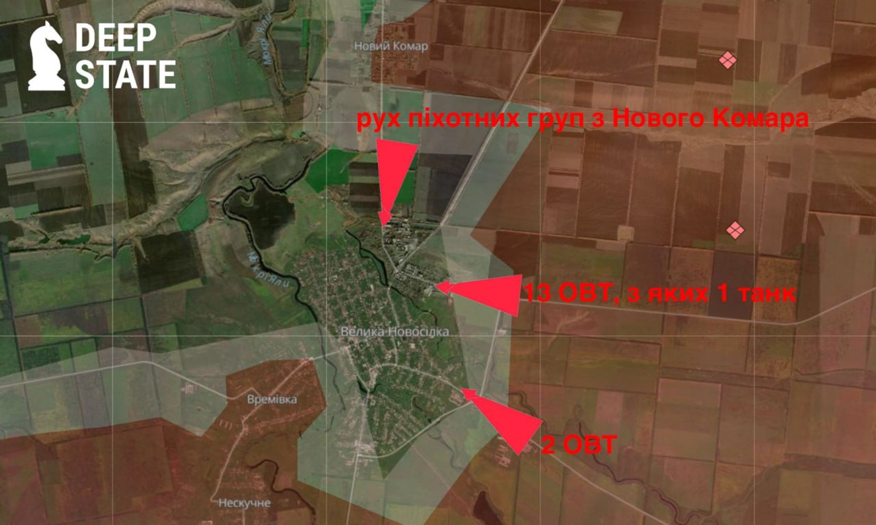 Аналитики DeepState отмечают продвижение ВС РФ около Времевки и начало штурма Великой Новосёлки как минимум с двух сторон: востока и севера. Ранее они указывали, что российское командование планирует окружить населенный пункт с целью избежать боев в застройке.