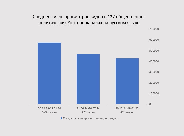 За последний месяц (с 20 декабря по 19 января) среднее число просмотров одного ролика в анализируемой группе составило 428 тысяч против 573 годом ранее, то есть падение на 26%.