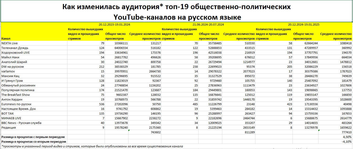 Среди каналов из Топ-20, кто смог нарастить среднее число просмотров: NEXTA Live, «Ходорковский LIVE», «Майкл Наки», «Анатолий Шарий», «И грянул Грэм», «Популярная политика», The Breakfast Show, «Настоящее время. Док», «Минаев LIVE» и «BBC News — Русская служба».