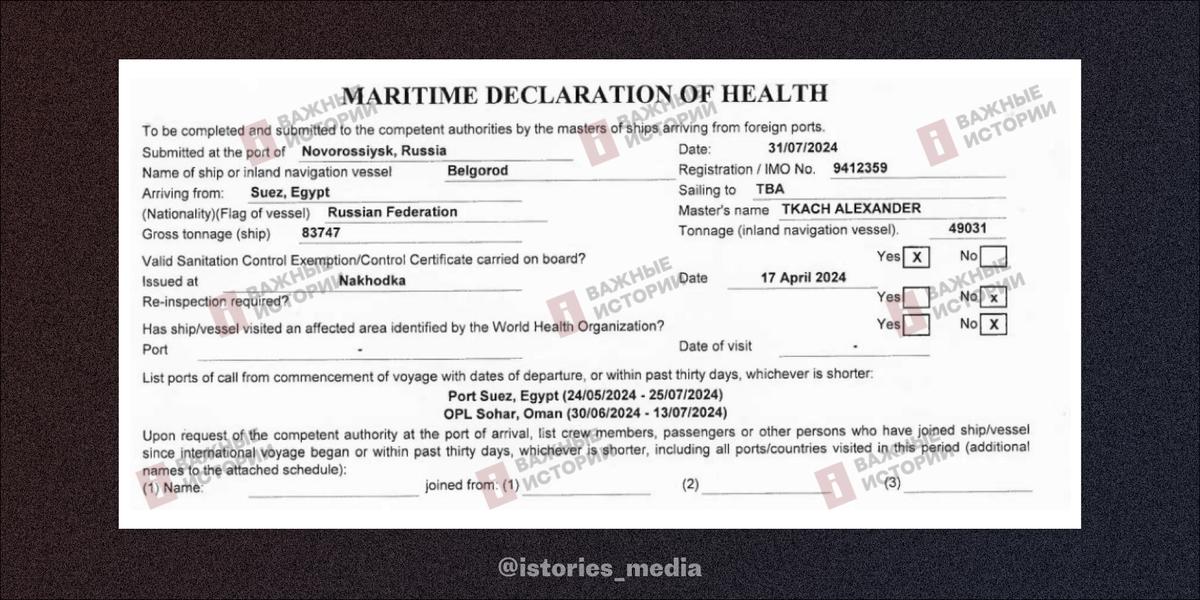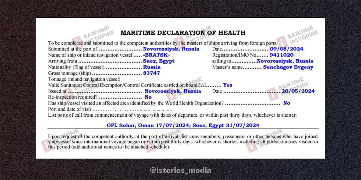 As IStories ascertained, the captains of both tankers indicated that they visited the OPL (Off Port Limits) zone of the port of Sohar in Oman on the same dates when journalists suspected them of being connected to Oxis. Bratsk was in the Omani port zone on July 17, 2024, and Belgorod on June 30 and July 13. When departing on these voyages, both tankers listed China as their destination country, but did not specify the port. This information comes from Russian port data.