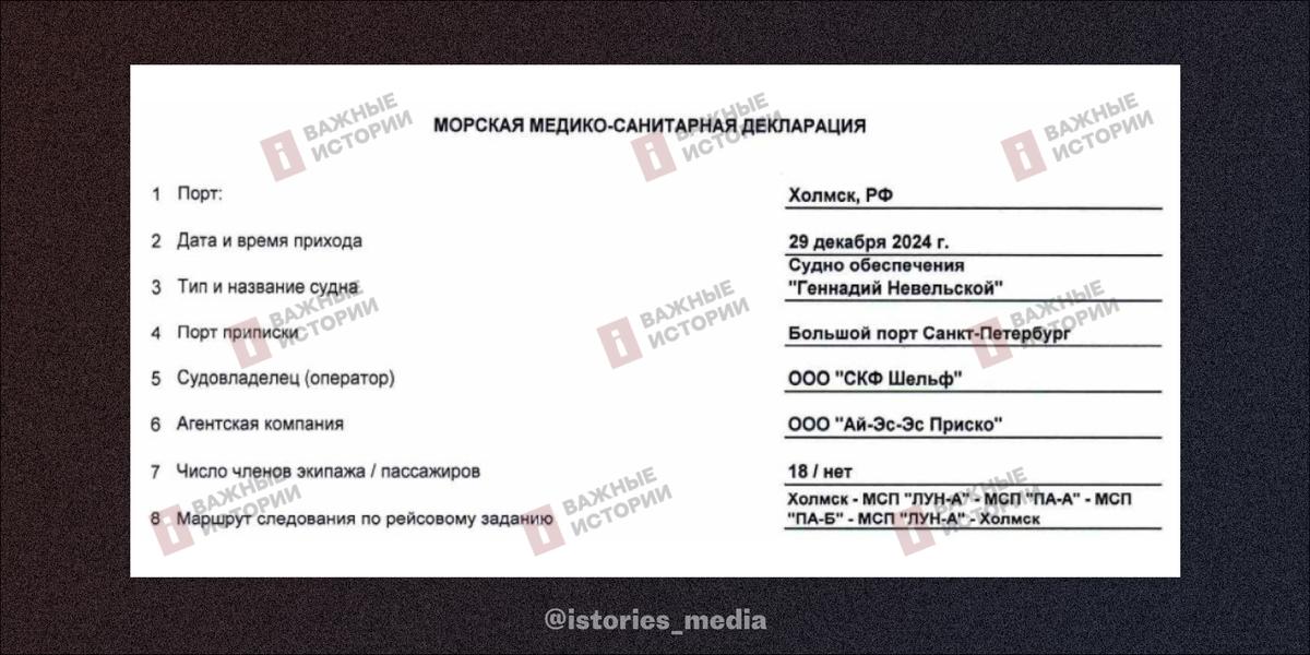 One of the supply vessels, Vitus Bering, services the Berkut platform, Russia’s largest offshore oil and gas drilling platform, located 25 km from Sakhalin. This is evident from its Maritime Declarations of Health, which also indicate the vessel’s route on its last voyage. The Berkut platform was installed in 2014 as part of the international Sakhalin-1 project, which also involved the American company ExxonMobil. Its assets were transferred to Russian ownership in 2022, and a subsidiary of Rosneft became the operating company of Sakhalin-1.