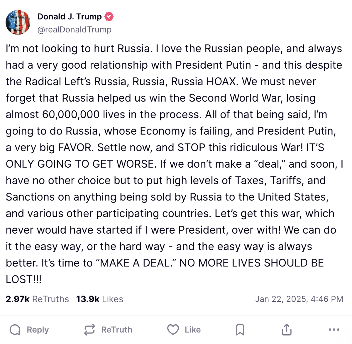 Трамп впервые в роли президента США публично назвал рычаги давления, которые, по его мнению, могут принудить Россию к мирной сделке. Ранее он и его сторонники предлагали оказать ВСУ многомиллиардную поддержку (в случае отказа Путина садиться за стол переговоров) и снять санкции с РФ (если он согласится). Киев хотели принудить к переговорам под угрозой прекращения поставок вооружений. Трамп не упоминал, к какому из вариантов он склоняется.