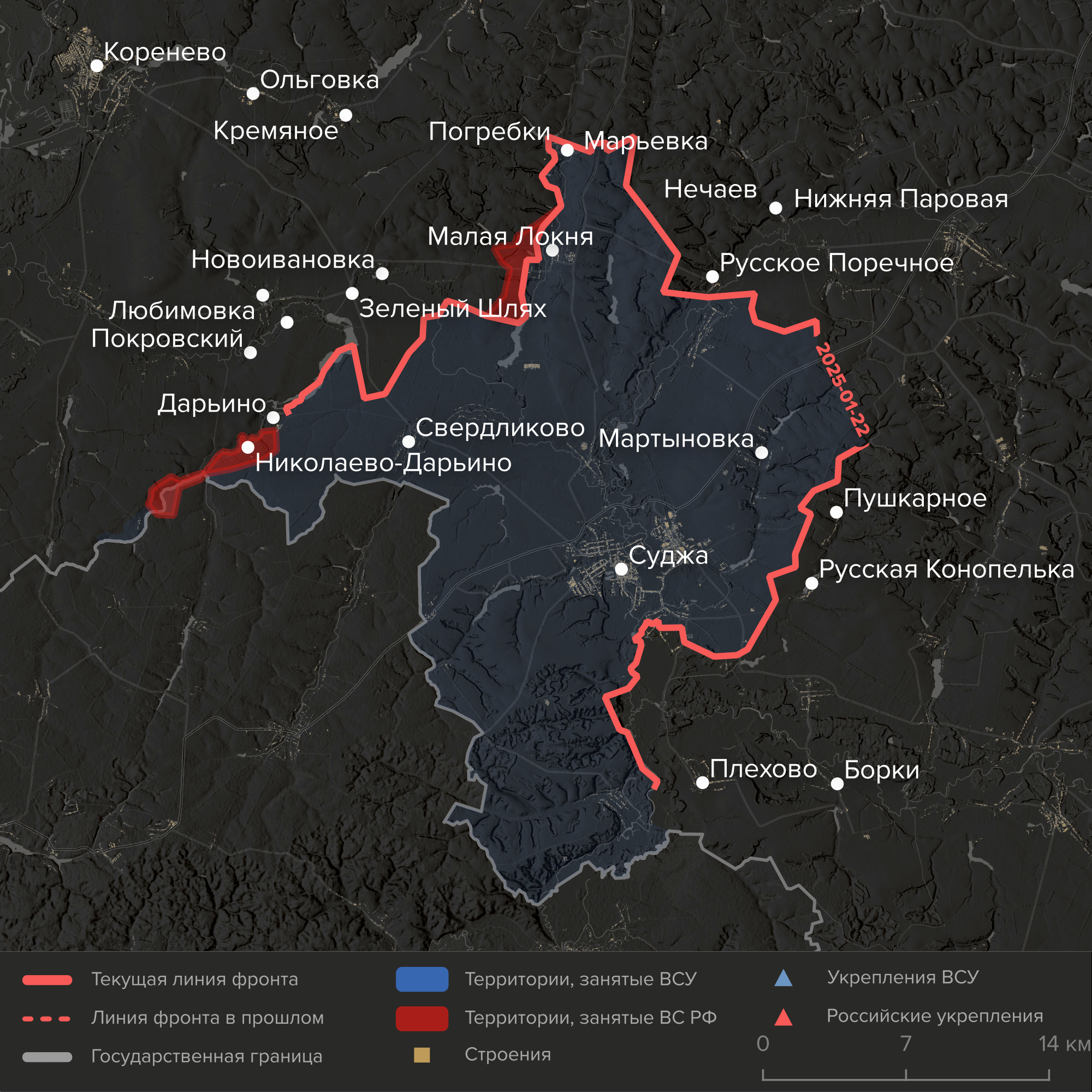 - После месяцев российского наступления эмпирически выяснилось, что оборона ВСУ имеет несколько критически важных пунктов: село Малая Локня, на котором держится вся оборона на севере плацдарма; Свердликово у границы с Украиной в юго-западной части; южные окраины Суджи.