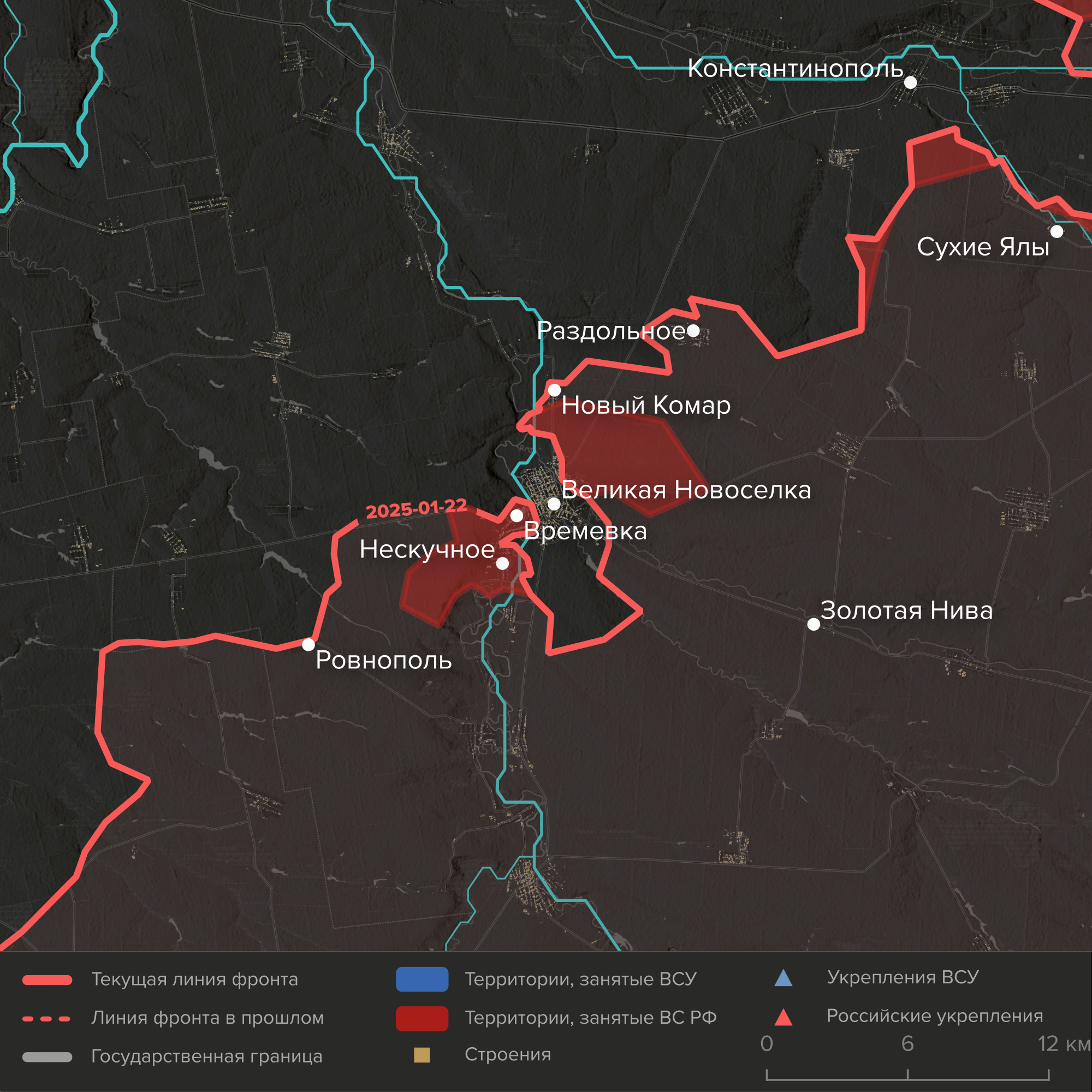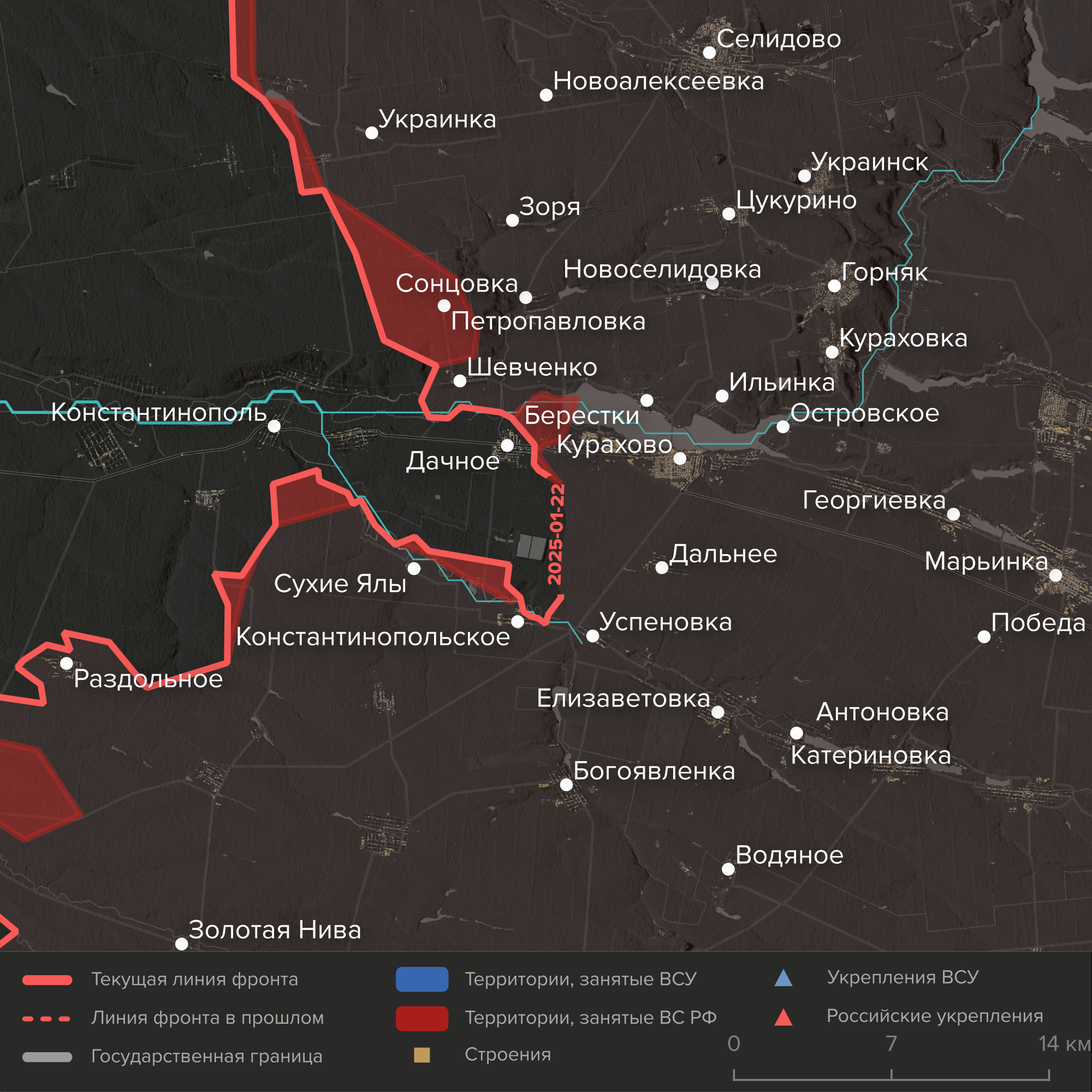 - На севере ВС РФ наступают вдоль Волчьей — уже захватили села Шевченко и Петропавловка и вышли к окраинам Андреевки. На юге они форсировали Сухие Ялы у одноименного села, а также подошли вплотную к Константинополю. Российские войска, наступающие из Курахово, штурмуют украинский район в селе Дачное.