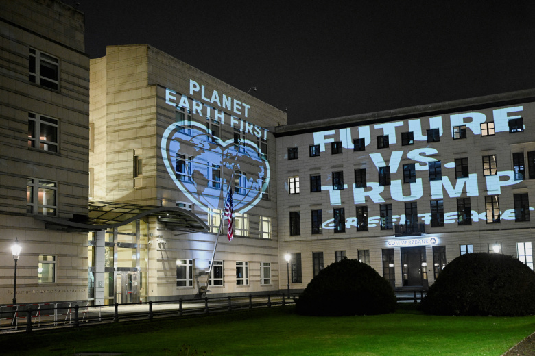 Берлин, 21 января 2025 года, видеопроекция активистов Greenpeace на здании посольства США