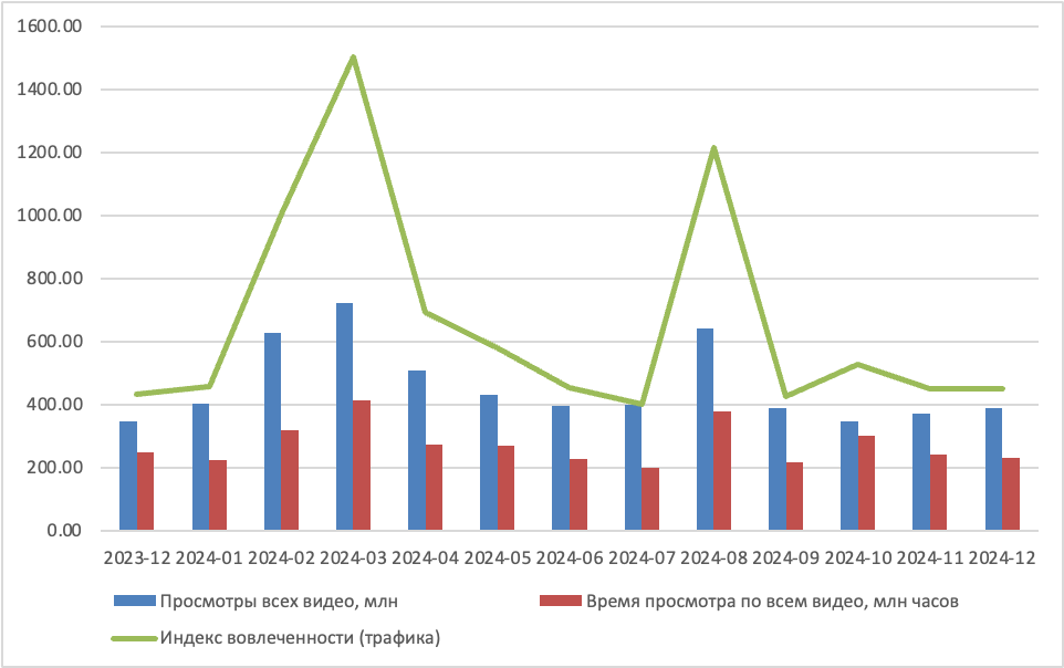 По сути, два показателя (общее число просмотров и общая длительность) дополняют друг друга, а их пересечение и дает то, что называется трафик, измеряемый в человеко-часах. Динамика этих показателей на протяжении 13 месяцев (декабрь 2023 — декабрь 2024) для нашей выборки из 20 репрезентативных каналов отражена на графике, где комбинированный показатель «Индекс вовлеченности» получен за счет перемножения длительности просмотров и их числа (деленного на 200 для соразмерности).