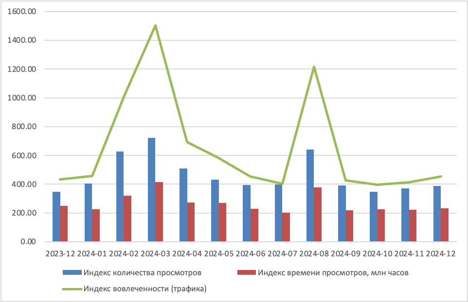 По сути, два показателя (общее число просмотров и общая длительность) дополняют друг друга, а их пересечение и дает то, что называется трафик, измеряемый в человеко-часах. Динамика этих показателей на протяжении 13 месяцев (декабрь 2023 — декабрь 2024) для нашей выборки из 20 репрезентативных каналов отражена на графике, где комбинированный показатель «Индекс вовлеченности» получен за счет перемножения длительности просмотров и их числа (деленного на 200 для соразмерности).