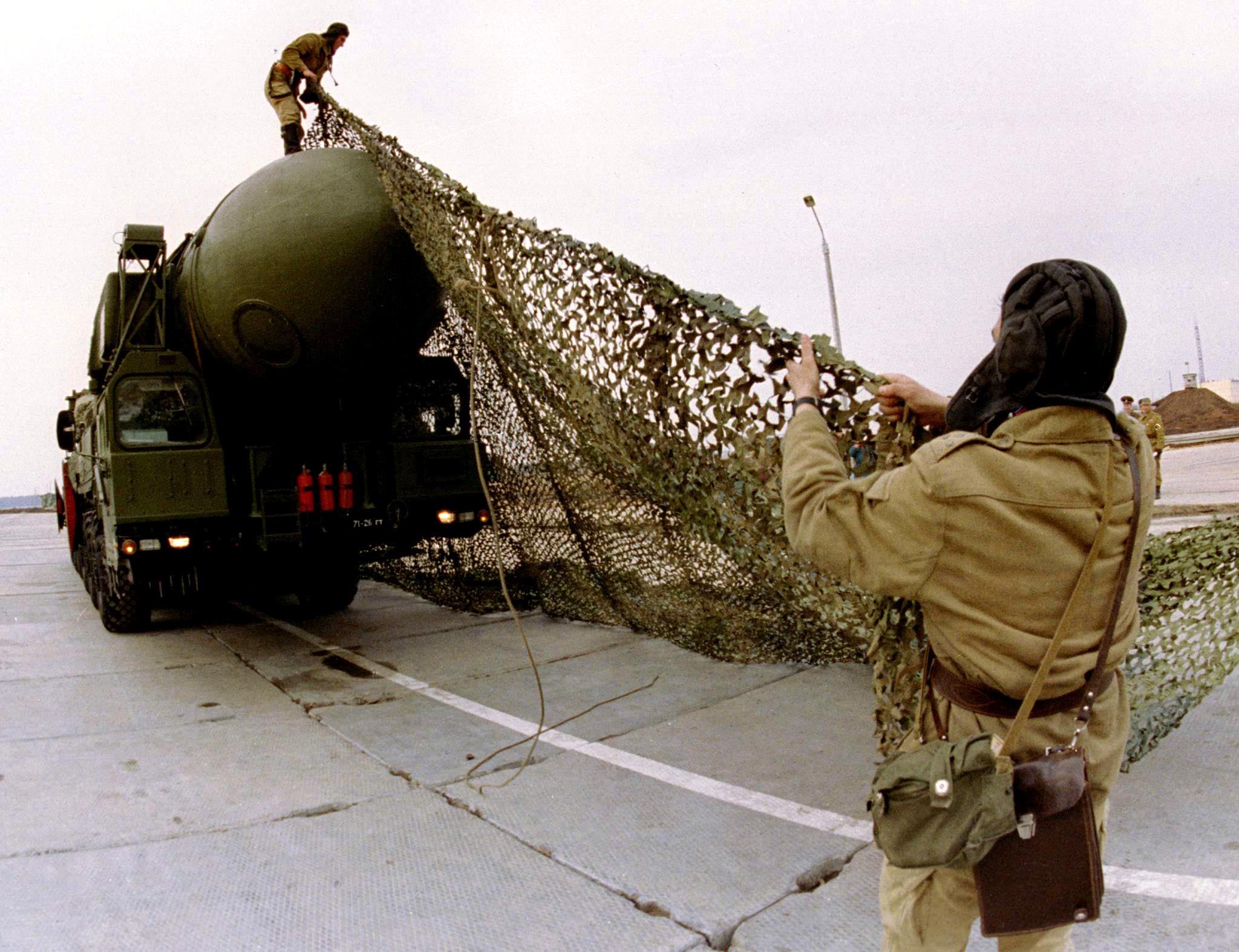 Фото: Российские военнослужащие снимают маскировочную сеть с пускового комплекса «Тополь-12М», способного нести стратегические ядерные боеголовки. Reuters