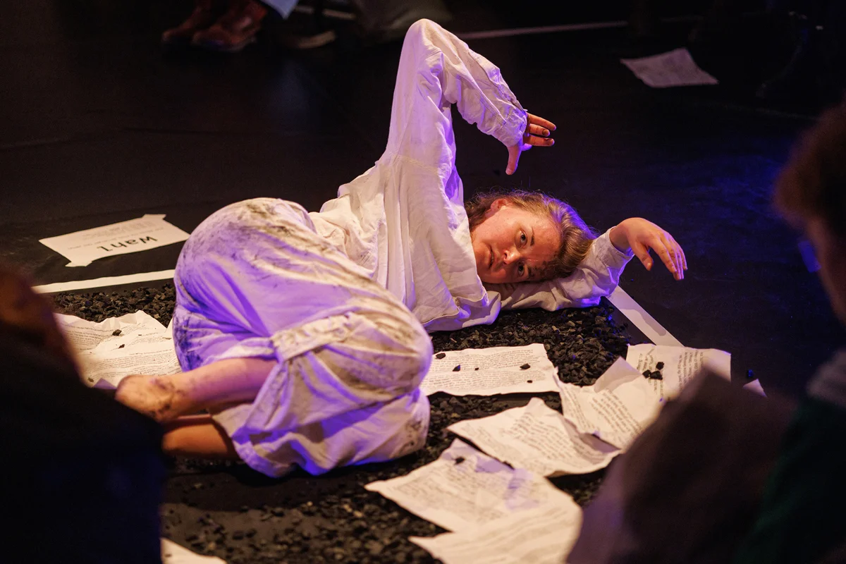 В центре маленькой комнаты насыпана кучка угля, на нем лежат листы с высказываниями россиян в соцсетях весной 2022-го. Пока зрители шуршат бумажками, перформерка босиком становится на острые угли, танцует, извивается, постепенно — когда листки разобраны — ложится на уголь. Конечно, Сапижак следует принципам Марины Абрамович — ее боль и усилия по ее преодолению передаются собравшимся, но она беззащитна перед их намерениями. Любой зритель может прочесть выбранный им текст у микрофона или рассказать свою историю. Перформанс заканчивается, когда на углях остается один листок с высказыванием (его, вставая, зачитывает Маша). Можно представить, с каким ужасом воспринимали всё это участники первых показов — в Ереване и Тбилиси в 2022-м. Сегодня действуют не столько сказанные вслух слова, сколько воспоминания о том шоке, испытанном людьми в РФ, из-под которых буквально выдернули их страну.