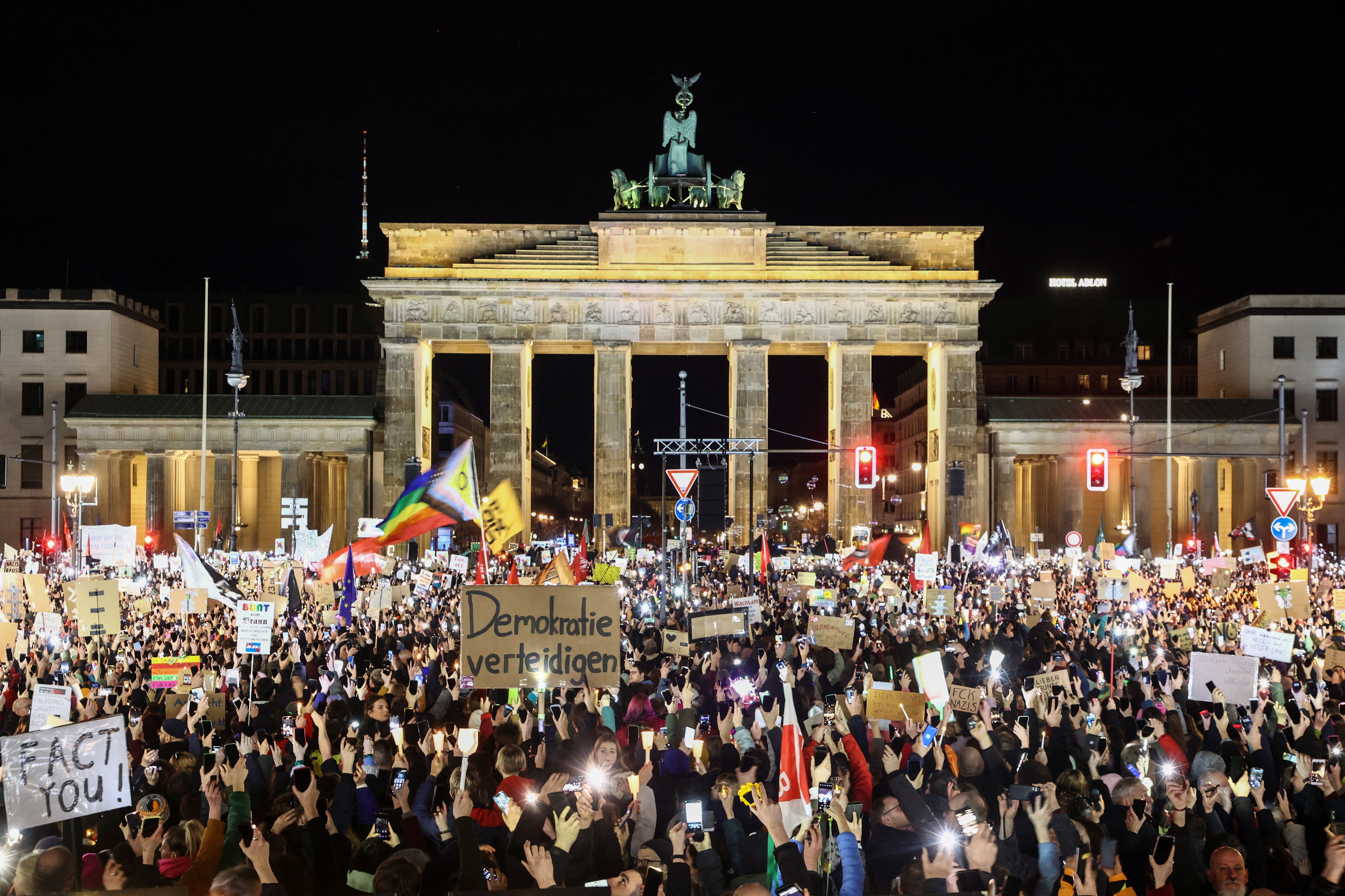 В Берлине митинг прошёл перед Бранденбургскими воротами недалеко от бундестага и администрации канцлера. Протестующие скандировали: "Мы – противопожарная стена против АдГ!" На некоторых плакатах был лозунг "Альтернатива для Германии" безальтернативно глупа".