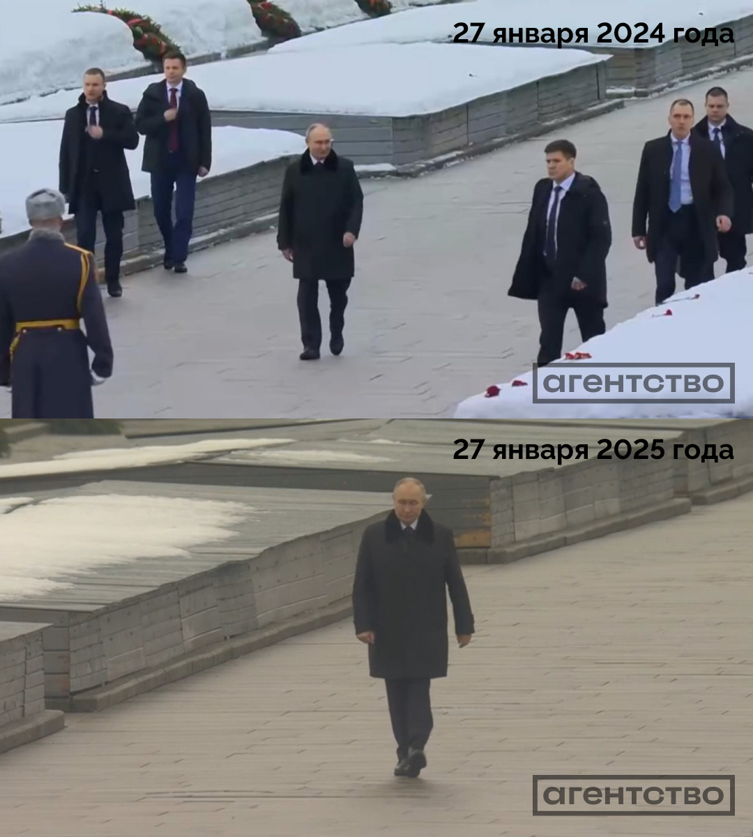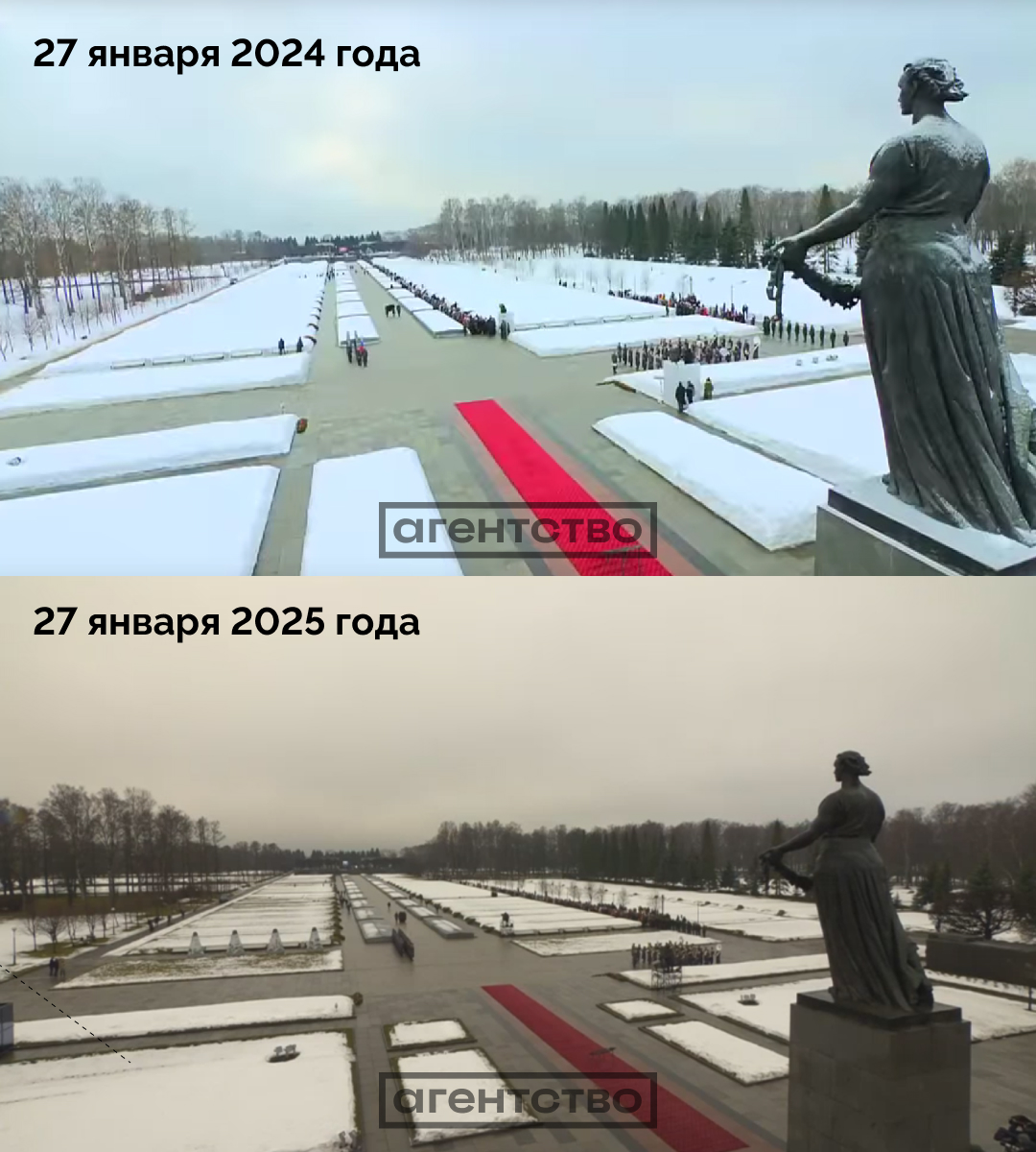 - В 2024 году люди стояли на боковой дорожке центральной аллеи. В этом же году их отодвинули на одну из аллей между братскими могилами. Таким образом, расстояние между президентом и людьми за год увеличилось более, чем в три раза — примерно с 10 метров до 35, свидетельствуют измерения «Агентства» с помощью сервиса «Яндекс.карты».