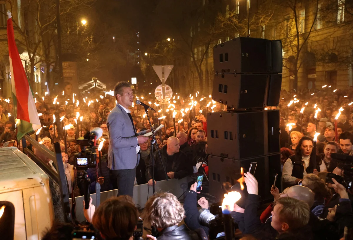 Петер Мадьяр выступает с речью во время протеста с требованием отставки главного прокурора Петера Полта и премьер-министра Виктора Орбана, Будапешт, Венгрия, 26 марта 2024 года. Фото: Zsolt Szigetvary / Reuters / Scanpix / LETA