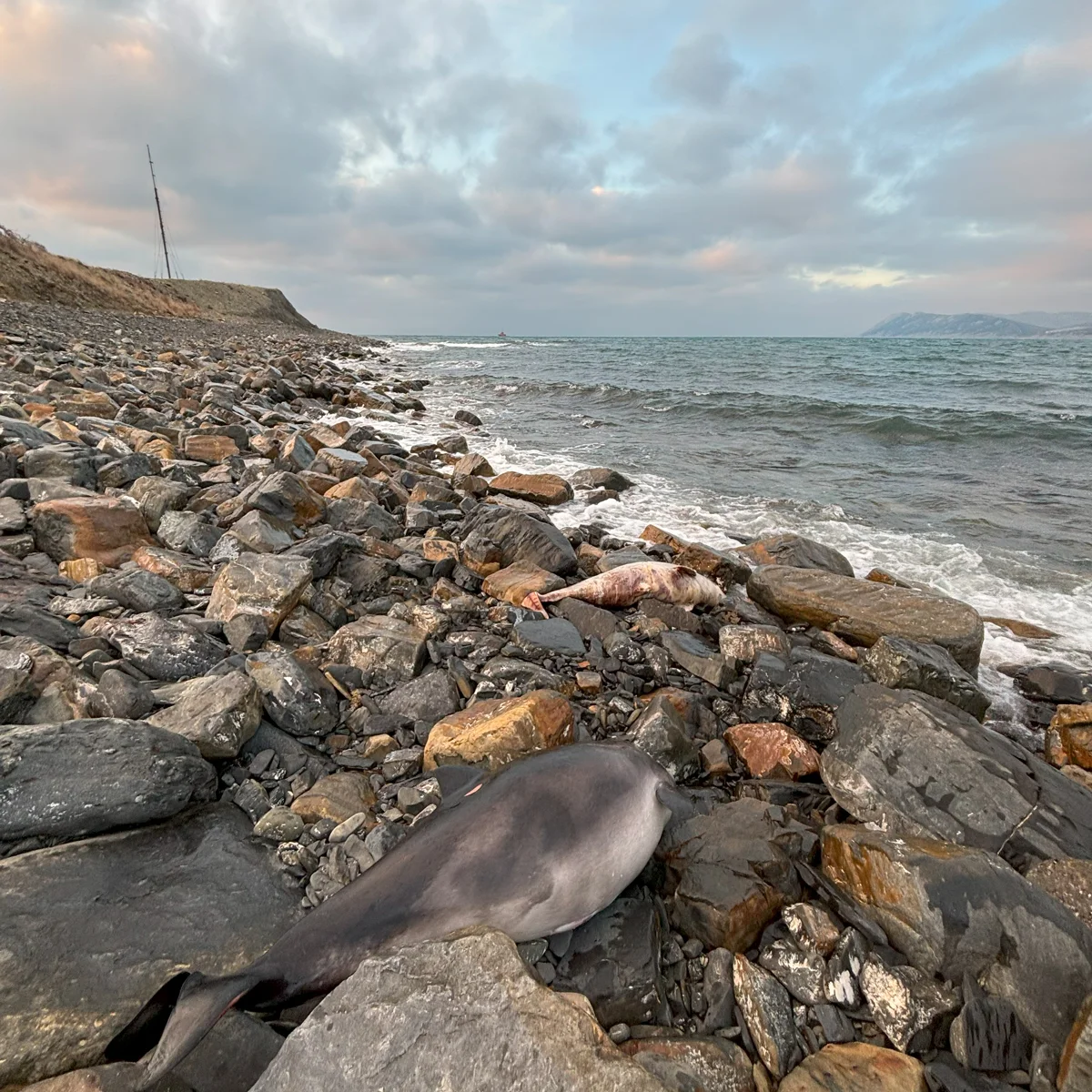 Спустя часа три возвращаемся в Большой Утриш. Без птиц, но это нормально, подбадривает Наталья, главное, что мы осмотрели береговую зону: другим волонтерам будет проще понимать, где могут быть скопления чомг. Решаем обойти главную достопримечательность села — маяк с монументом погибшим во Вторую мировую войну. Вдруг Наталья останавливается и пальцем показывает на камни. Там, в полуметре друг от друга, лежат два мертвых дельфина: еще совсем молодые, где-то в четверть размера взрослой особи. Один белый, другой черный, они развернуты головами к морю, а их рты безжизненно раскрыты. Наталья склоняется над ними и закрывает лицо руками.