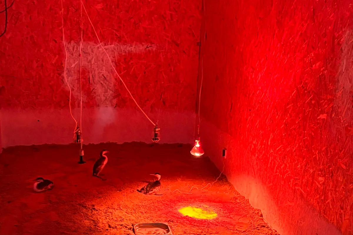 На сегодня работа закончена: мы прошли больше 15 километров. Восполняем калории в столовой штаба — сегодня дают булгур с рыбой. К нам подсаживается Артем из Москвы, с которым я на дежурстве играл в карты: оказывается, это он накануне строил вольеры для восстановившихся птиц под музыку Rammstein. Сегодня в домики заселили первых постояльцев. Наталья смотрит на него умоляющими глазами — Артем сдается и ведет нас на экскурсию. За семью бассейнами, в которых спасенные птицы вновь будут плавать, стоят маленькие вольеры. Восемь уже готовы, остальные строятся — в помещении бывшего штаба на 700 квадратных метров есть где развернуться. Артем медленно открывает дверь — за ней по толстому слою песка под специальной красной лампой гуляют три полностью здоровые чомги.