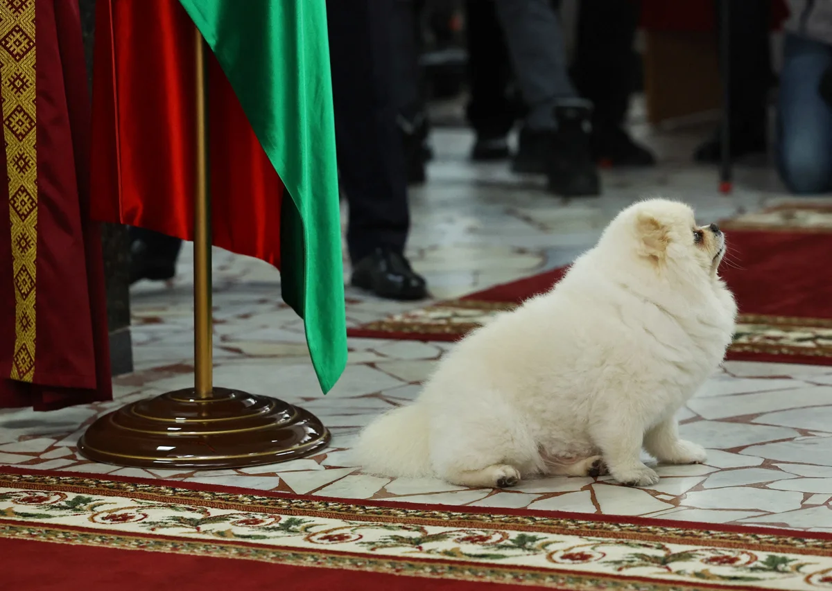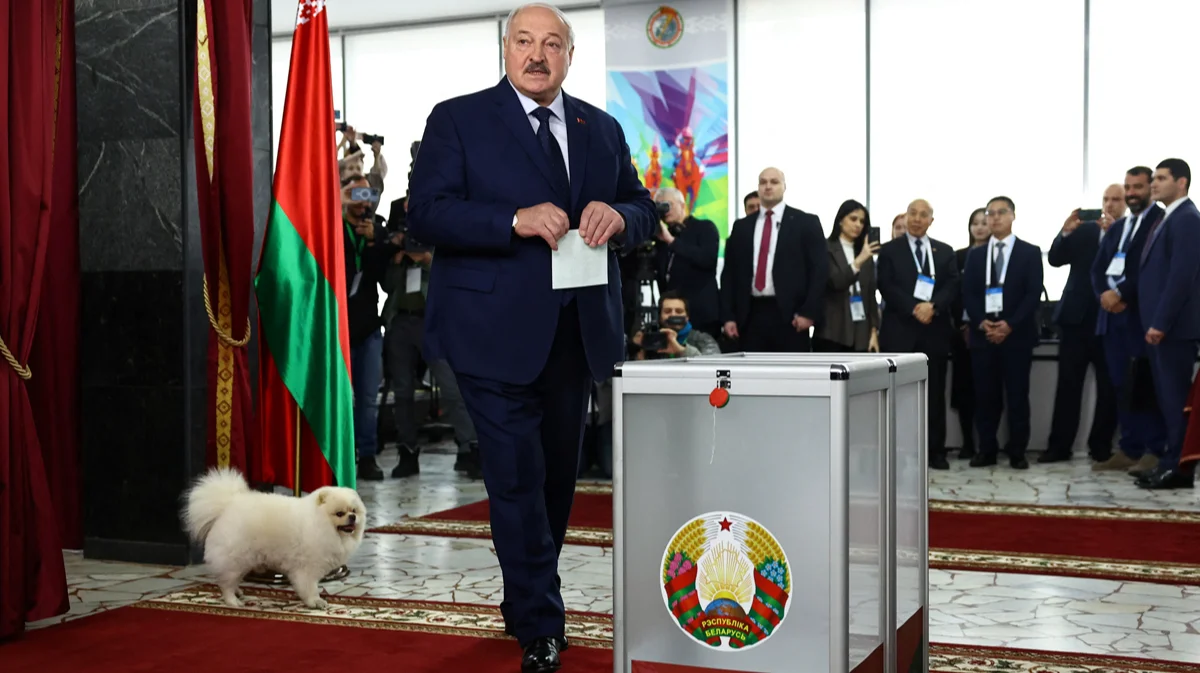 Александр Лукашенко голосует на избирательном участке во время президентских выборов вместе с собакой Умкой, Минск, Беларусь, 26 января 2025 года. Фото: Евгения Новоженина / Reuters / Scanpix / LETA