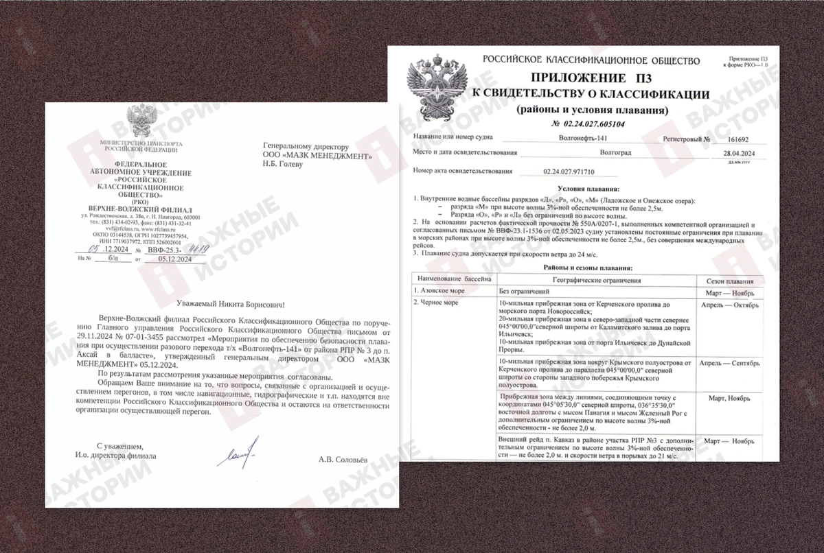 At least 7 Volgoneft tankers not only went to sea in violation of deadlines, but also followed the same route as the sunken vessels: from Rostov-on-Don to the transshipment area of the Kavkaz port in the Black Sea. Four tankers had permission to return from the Kavkaz port to Rostov-on-Don without cargo after November under the responsibility of the captain and the management company. However, none of these documents authorize the route from Rostov-on-Don to Kavkaz with thousands of tons of petroleum products on board.