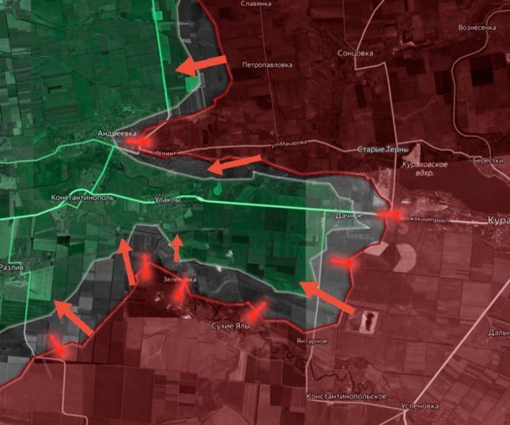 DeepState сообщает о продвижении ВС РФ около Дачного и Андреевки на правом и левом берегах реки Волчья. «Военкор» Котенок уверяет, что российские военные штурмуют центр Андреевки и контролируют четверть Дачного. По его мнению, вероятен скорый прорыв к Константинополю и попадание украинской группировки в «котел».