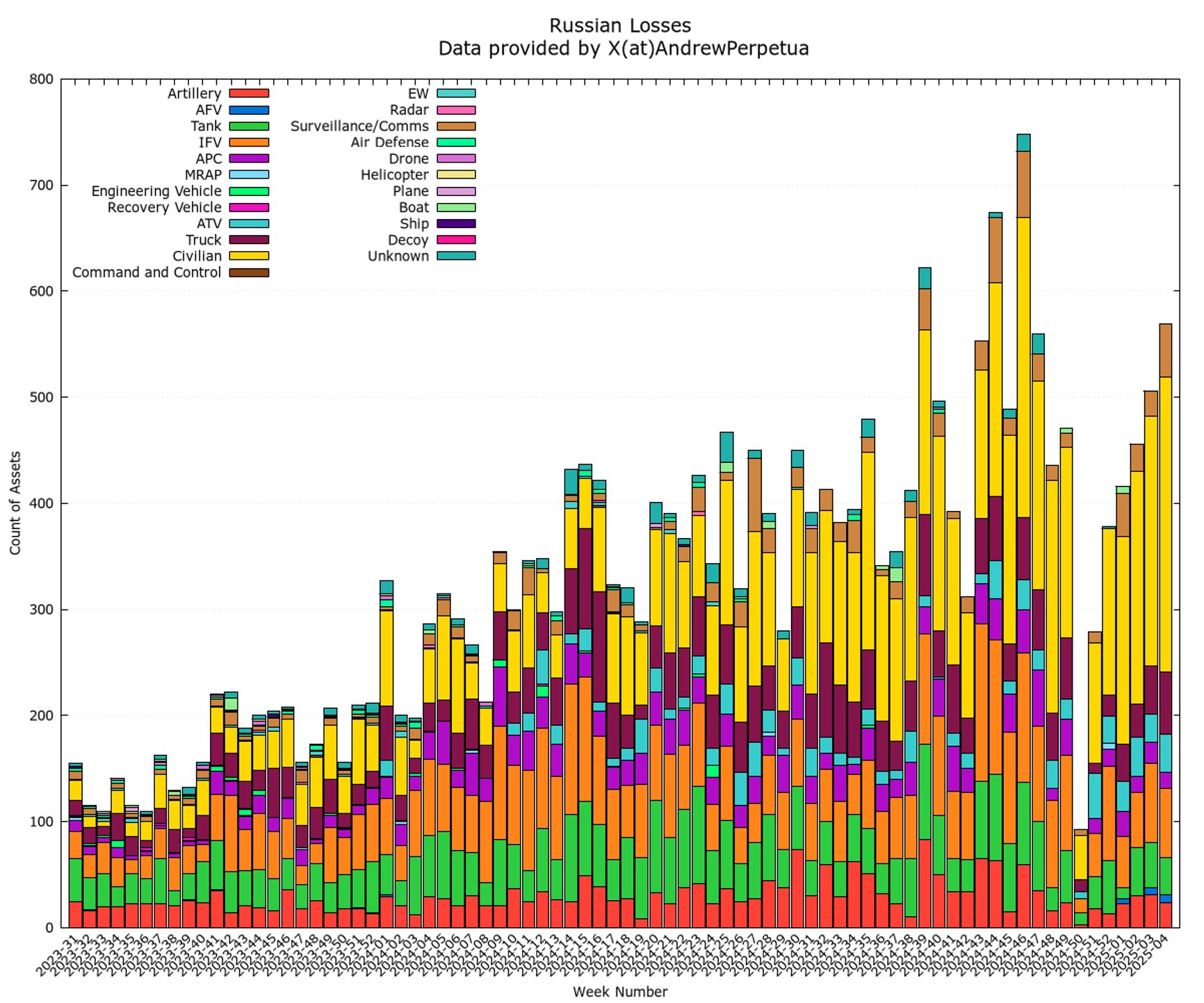 OSINT-исследователь Cyrus проанализировал статистику российских потерь, используя информацию Oryx и Andrew Perpetua. Оба источника указывают на снижение потерь бронетехники. Однако, поскольку общие потери остаются высокими, это может свидетельствовать не об улучшении ситуации для ВС РФ, а о нарастающем дефиците бронетехники.