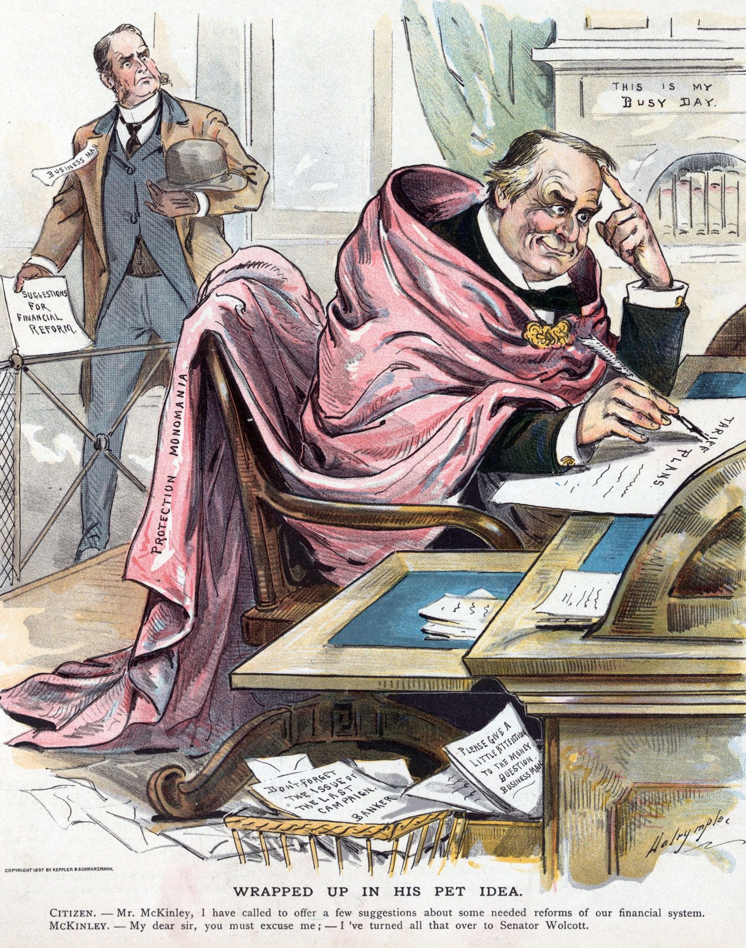 До избрания на пост президента Мак-Кинли был конгрессменом и так активно боролся за повышение пошлин на импортные товары, что в его честь назвали принятый в 1890 году закон, который увеличил сборы на импорт с 38% до 49,5%. Критики говорили, что он выгоден крупному бизнесу, а для остальных лишь повышает цены. На фоне поднявшегося недовольства республиканцы уступили демократам большинство в Конгрессе, а спустя два года и президентский пост.