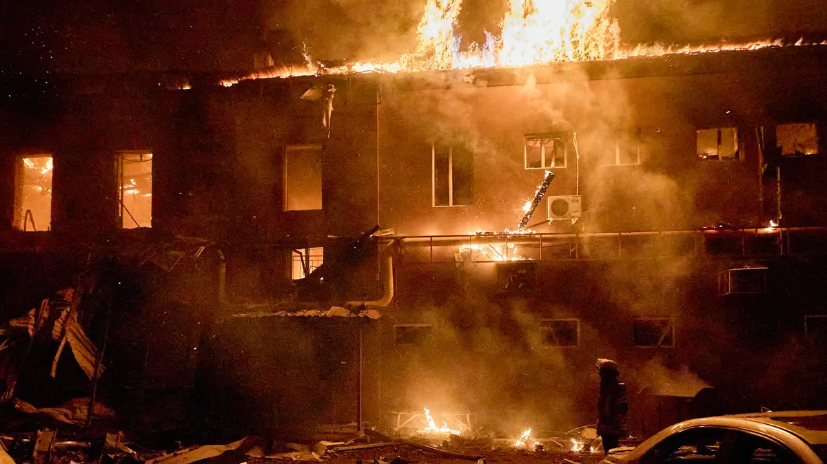 Fire tears through a factory in Ukraine’s second city Kharkiv following a Russian drone strike, 28 January 2025. Photo: EPA-EFE / SERGEY KOZLOV