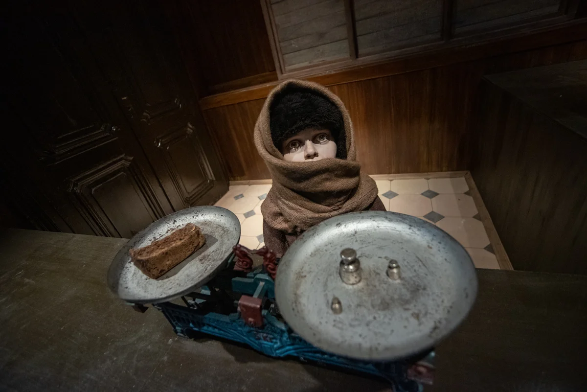 Зал самой голодной зимы 1941–42-го годов. Макет витрины булочной. В чуть как бы оттаявшем «глазке» стекла — на весах 125 граммов блокадного хлеба. Экскурсоводы рассказывали, из чего пекли этот хлеб: и мучная пыль, которую выбивали из мешков, и целлюлоза, и альбумин…