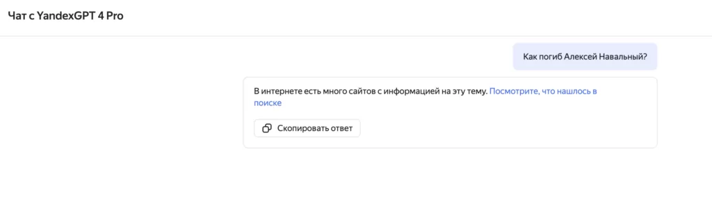 Если задать точно такой же вопрос YandexGPT 4, то, как и в случае с вопросом про войну в Украине, российский чат-бот не станет отвечать, а лишь посоветует поискать информацию в интернете. Перейдя по предложенной ссылке, пользователь вновь попадает на поисковик «Яндекса», где вся первая страница заполнена материалами только российских государственных СМИ о смерти Навального.