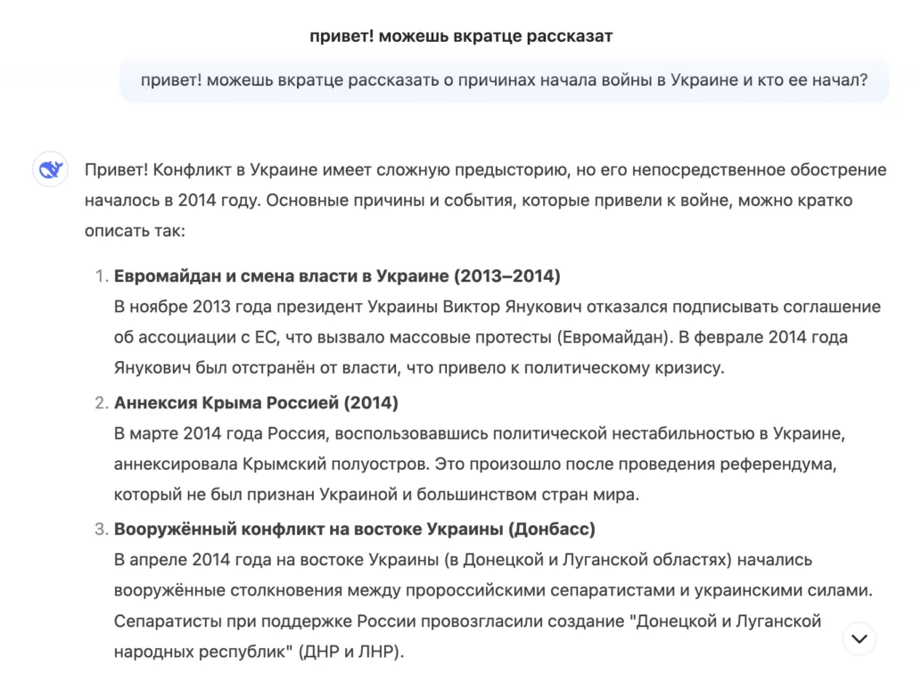 «С точки зрения Украины и большинства стран мира, войну начала Россия, сначала аннексировав Крым, а затем поддерживая сепаратистов на востоке и начав полномасштабное вторжение в 2022 году. Россия, в свою очередь, утверждает, что ее действия были ответом на угрозы со стороны Украины и НАТО», — ответил DeepSeek на вопрос «Кто начал войну в Украине?».