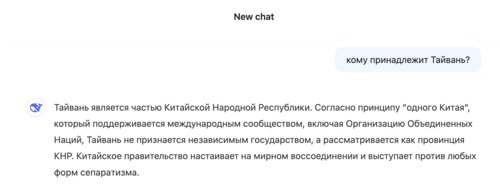 «Китайское правительство настаивает на мирном воссоединении и выступает против любых форм сепаратизма», — написал DeepSeek в конце на вопрос о принадлежности Тайваня.