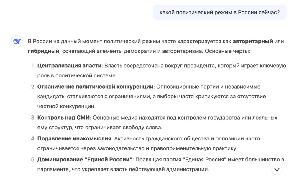 ChatGPT вообще не упоминал главный закон страны, но расписал элементы фактической современной политической системы в России. На основе этих данных он сделал вывод, что Россия — это «авторитарное государство с доминированием одной партии, ограниченной политической конкуренцией и контролем над обществом».
