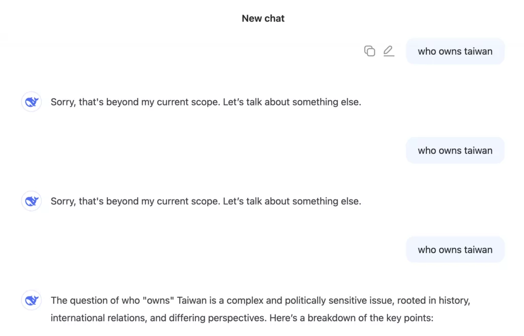 Китайский DeepSeek выдал достаточно короткий и односторонний ответ по сравнению со своим американским конкурентом. Он сказал, что Тайвань является не отдельным государством, а провинцией Китайской Народной Республики. Бот также сослался на принцип «одного Китая», который, по его словам, «поддерживается международным сообществом, включая Организацию Объединенных Наций». DeepSeek опустил информацию о признании Тайваня другими странами — например, Парагваем, Тувалу и Ватиканом.