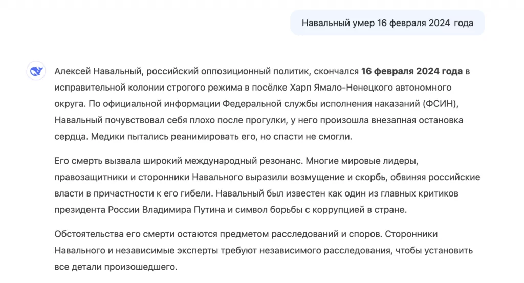 DeepSeek не скрыл тот факт, что российские власти обвиняются в причастности к гибели Навального, а его смерть «вызвала широкий международный резонанс». Нейросеть не стала описывать, как с ним обращались в колонии и что в 2020 году он был отравлен. Однако она признала, что Навальный был «одним из главных критиков президента России Владимира Путина и символом борьбы с коррупцией в стране».