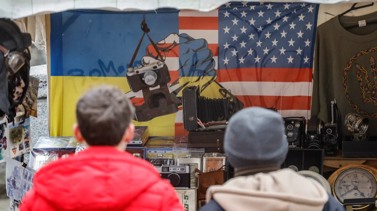 Сувенирный киоск с изображением флагов Украины и США в центре Киева, 20 января 2025 года. Фото: Sergey Dolzhenko / EPA