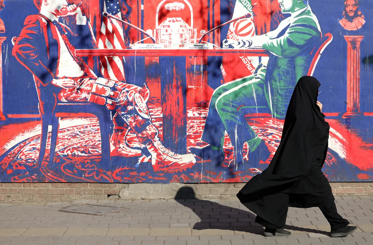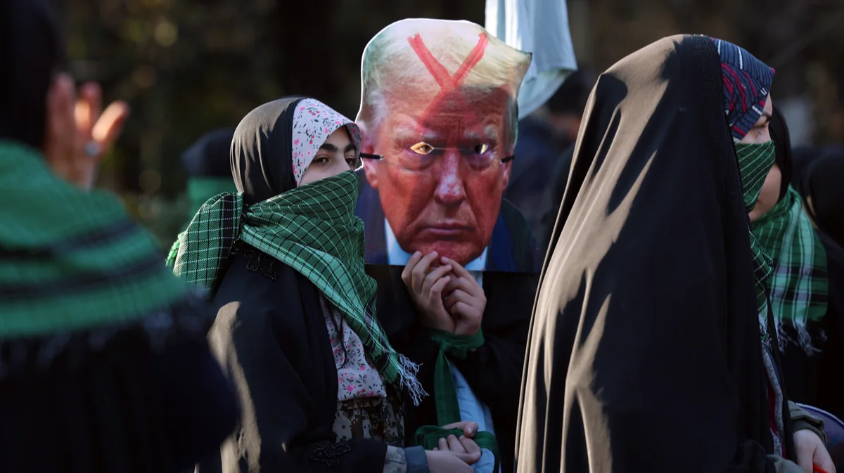 Члены женского ополчения Ирана (Басидж), держащие карикатуру на избранного президента США Дональда Трампа, маршируют во время антиизраильского митинга в знак солидарности с палестинским и ливанским народами, Тегеран, Иран, 10 января 2025 года. Фото: Abedin Taherkenareh / EPA