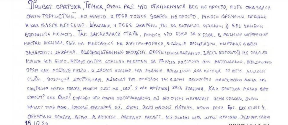 Но Ивану в известном смысле повезло: его взяли под опеку добрые люди из числа помогающих заключенным. Он стал получать продовольственные посылки и, как признался Иван в одном из благодарственных писем, впервые с сентября 2022 года почувствовал, что по его жилам течет кровь.