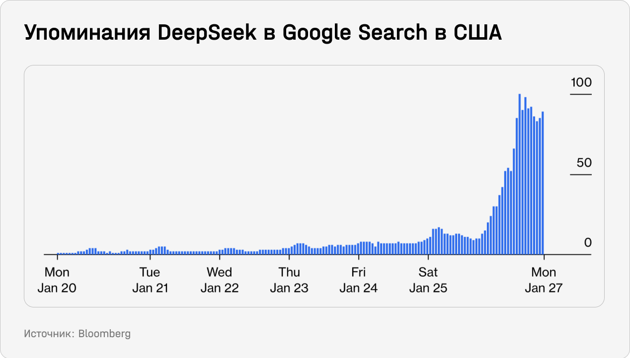 Китайский стартап DeepSeek, представивший 20 января чат-бот с генеративным ИИ R1, в начале недели не на шутку напугал рынки. Активно модель начала обсуждаться еще в пятницу, 24 января, а в выходные информация о ней завирусилась в соцсетях.