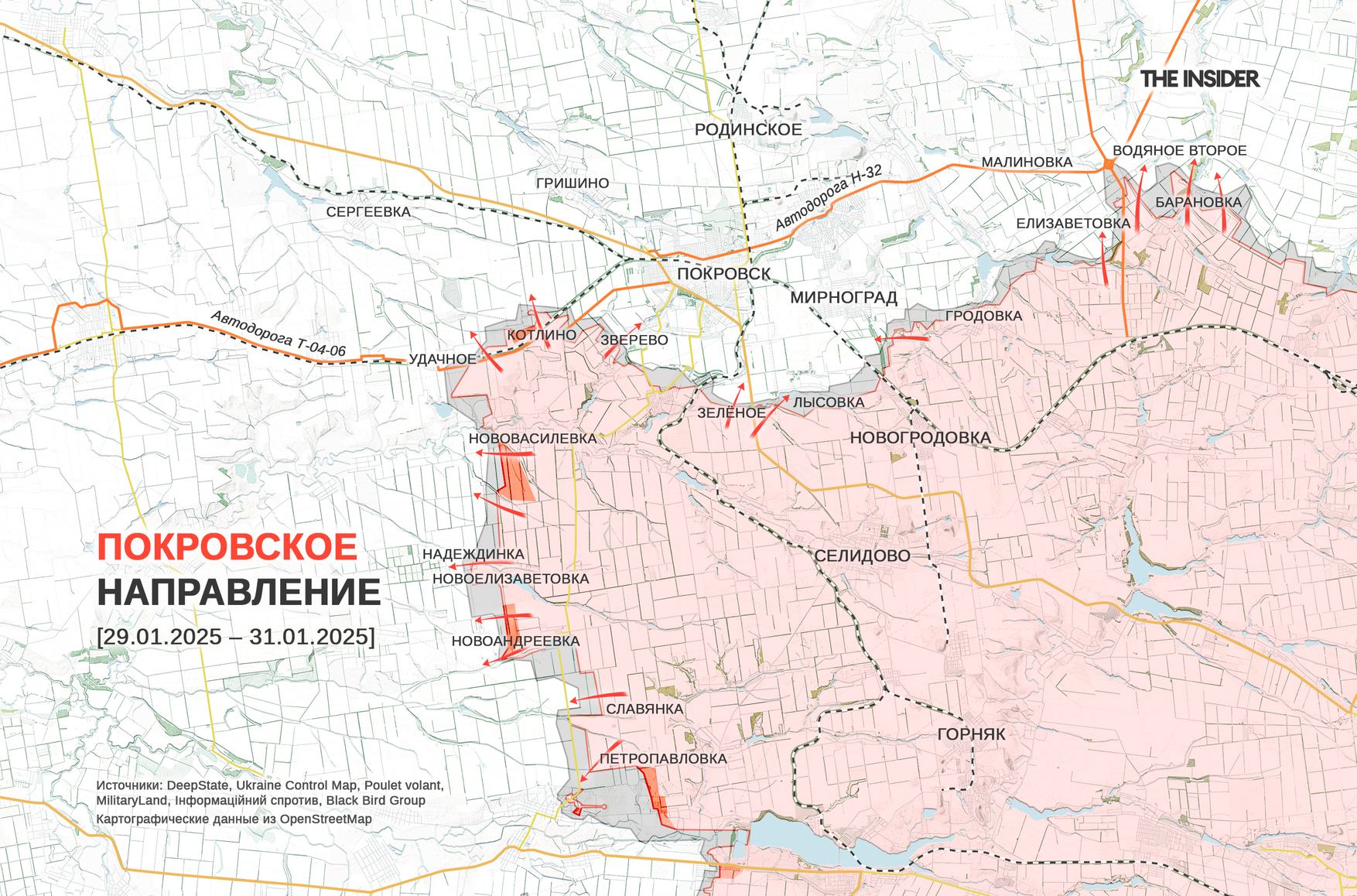 DeepState сообщает о незначительном продвижении ВСУ около Удачного и тактических успехах ВС РФ в Котлине (до 2016 года — Димитрово) на трассе западнее Покровска. Кроме того, аналитики проекта признают захват российскими военными Новоандреевки. В свою очередь Минобороны РФ отчиталось об «освобождении» населенных пунктов Зелёного, Новоелизаветовки и Нововасилевки.