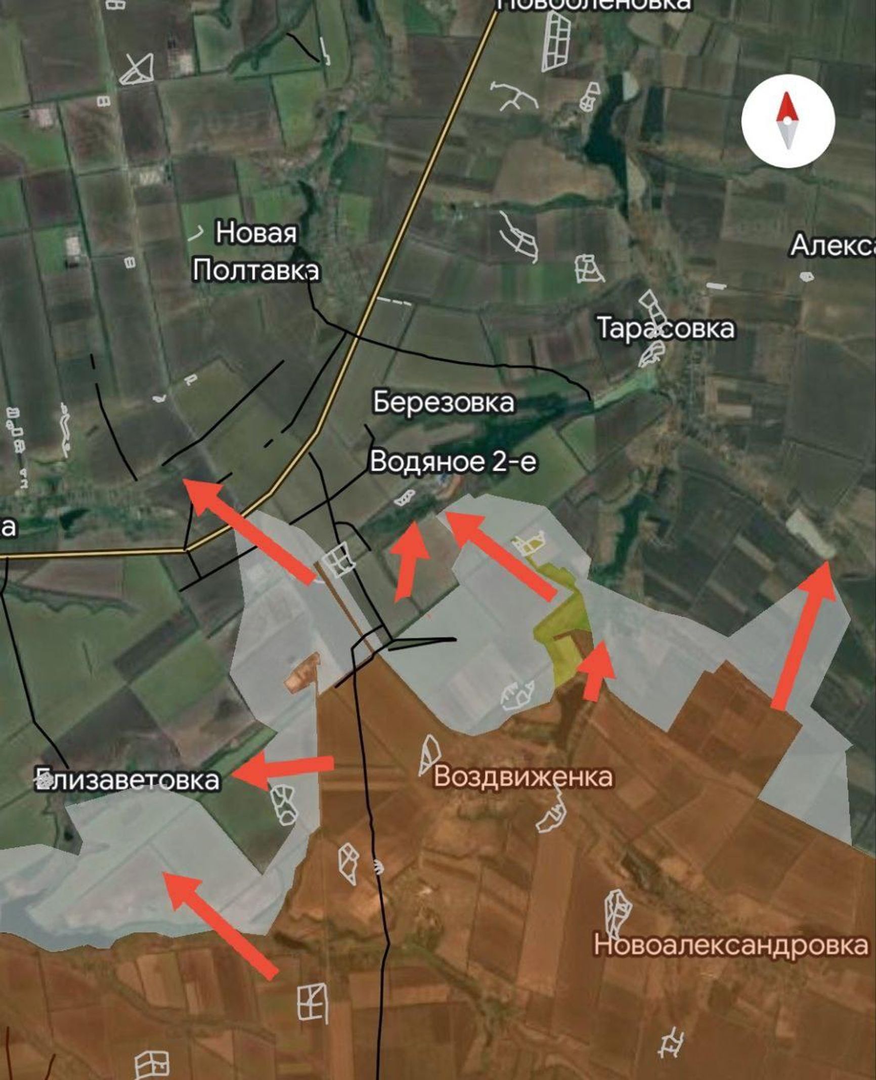 «Военкор» Юрий Котенок пишет о новых российских атаках на Елизаветовку и на позиции в районе Малиновки, которые прикрывают трассу в сторону Константиновки.