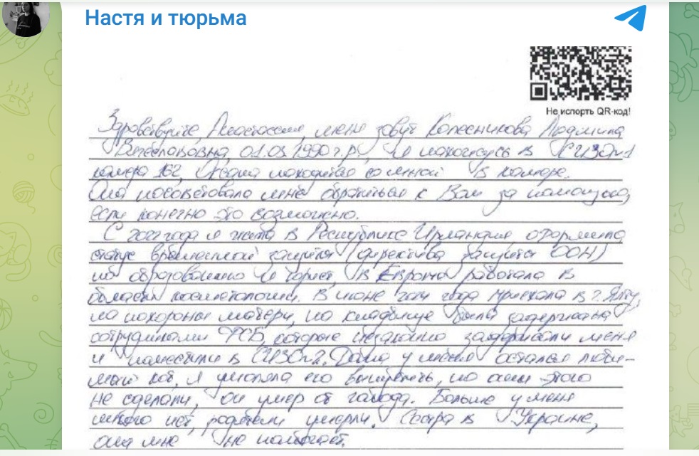 Спустя три месяца после задержания в российском Telegram-канале «Настя и тюрьма» появилось письмо от Людмилы Колесниковой из СИЗО Симферополя № 1. Из него следует, что крымчанку удерживают в изоляторе по обвинению в госизмене (статья 275 УК РФ).