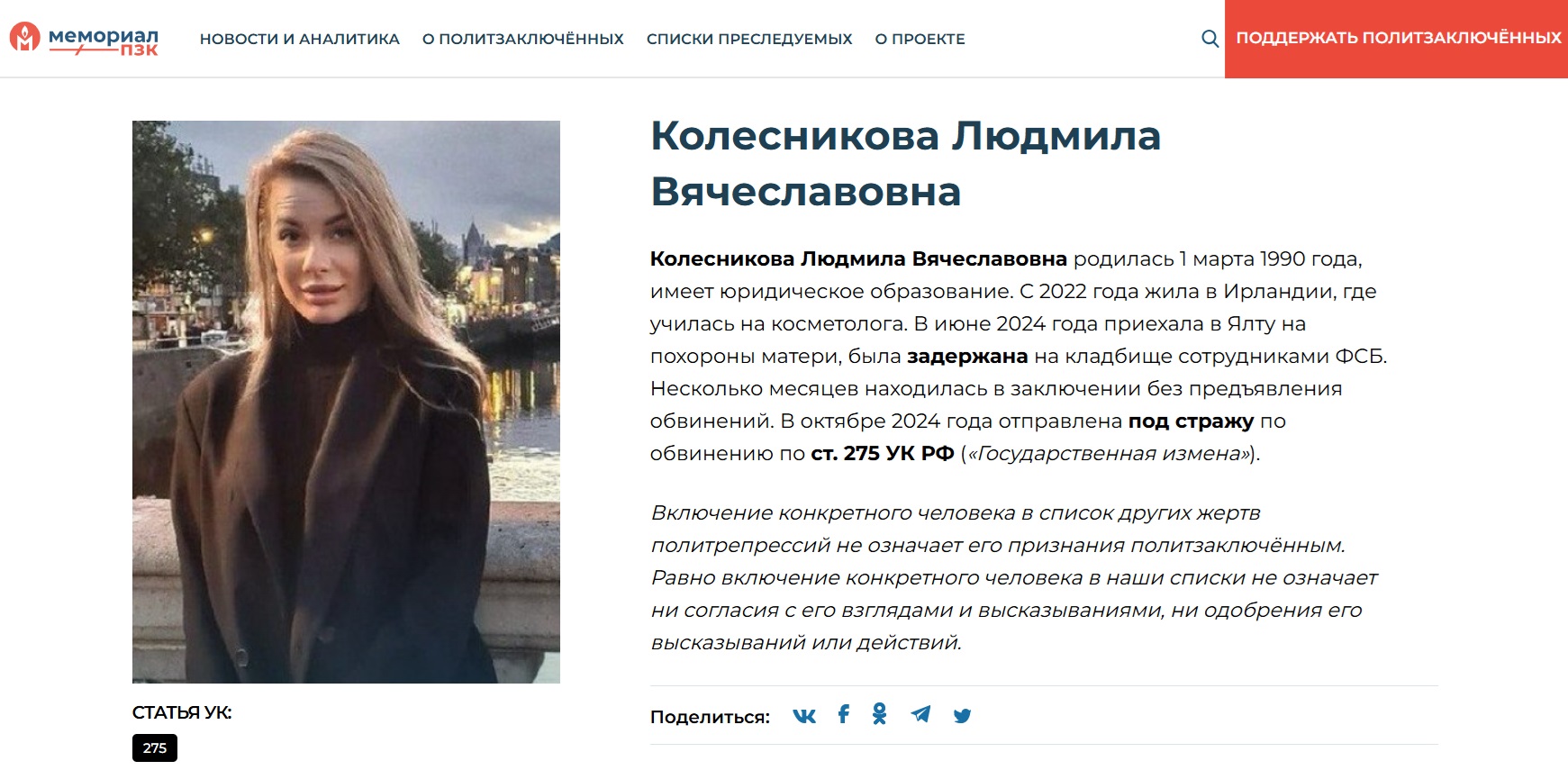 В июне 2024 года Людмила Колесникова вернулась в Крым, чтобы проведать тяжело больную мать. Вскоре женщина умерла, а крымчанку задержали сотрудники ФСБ.