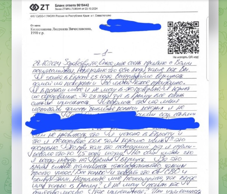 «Я в полном шоке и не могу в это поверить. За 2,5 года (пока Россия продолжает полномасштабное вторжение в Украину – КР) в Крыму все очень изменилось. Оказалось, что на меня написали доносы бывшие коллеги. Им не понравилось, что я уехала в Европу и показываю, как там хорошо жить. Это дословно. Сильно поменялось законодательство, законы – просто ужас. Все только и говорят, что об «СВО» (так в РФ называют свое полномасштабное вторжение в Украину – КР) и живут этим», – писала Людмила Колесникова из СИЗО в ноябре прошлого года.