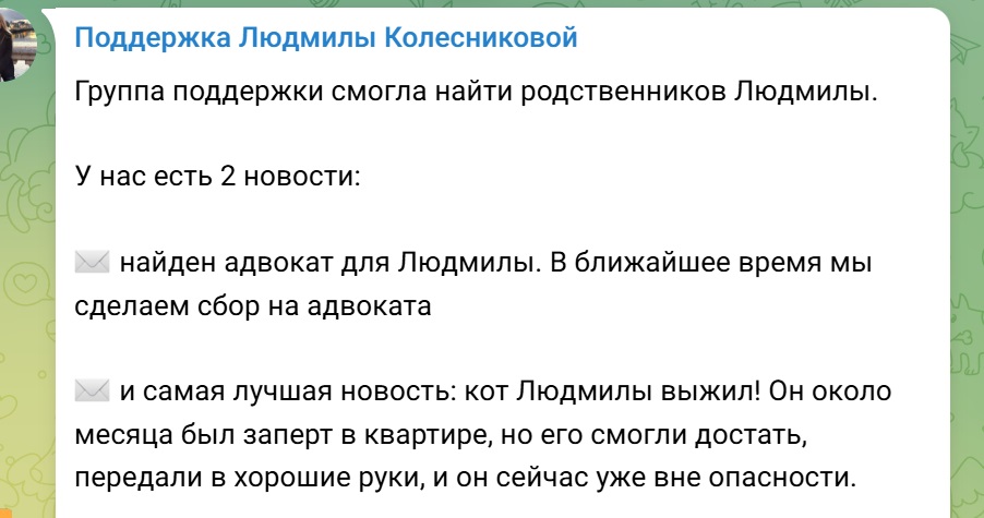 Активисты и волонтеры создали в поддержку Людмилы Колесниковой Telegram-канал, в котором публикуют информацию о ней и письма из СИЗО.