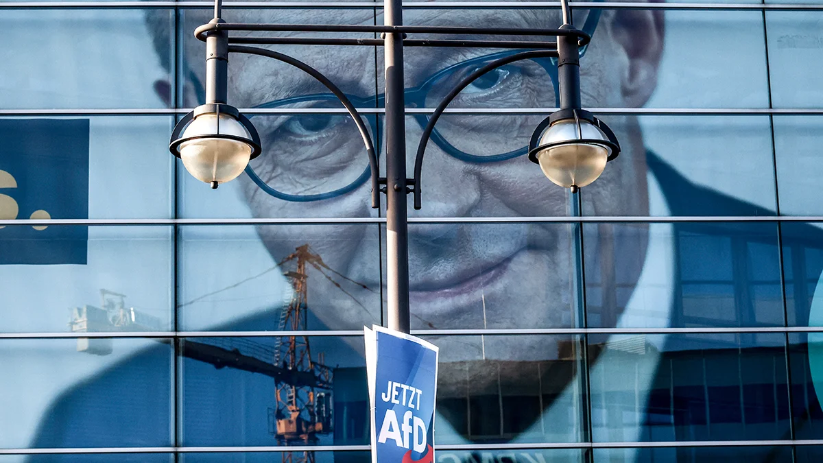 Плакат партии «Альтернатива для Германии» (AfD) на фонаре напротив масштабного предвыборного плаката председателя Христианско-демократического союза Германии (ХДС) Фридриха Мерца, который можно увидеть в штаб-квартире ХДС, доме Конрада Аденауэра, в Берлине, 13 января 2025 года. Фото: Filip Singer / EPA-EFE