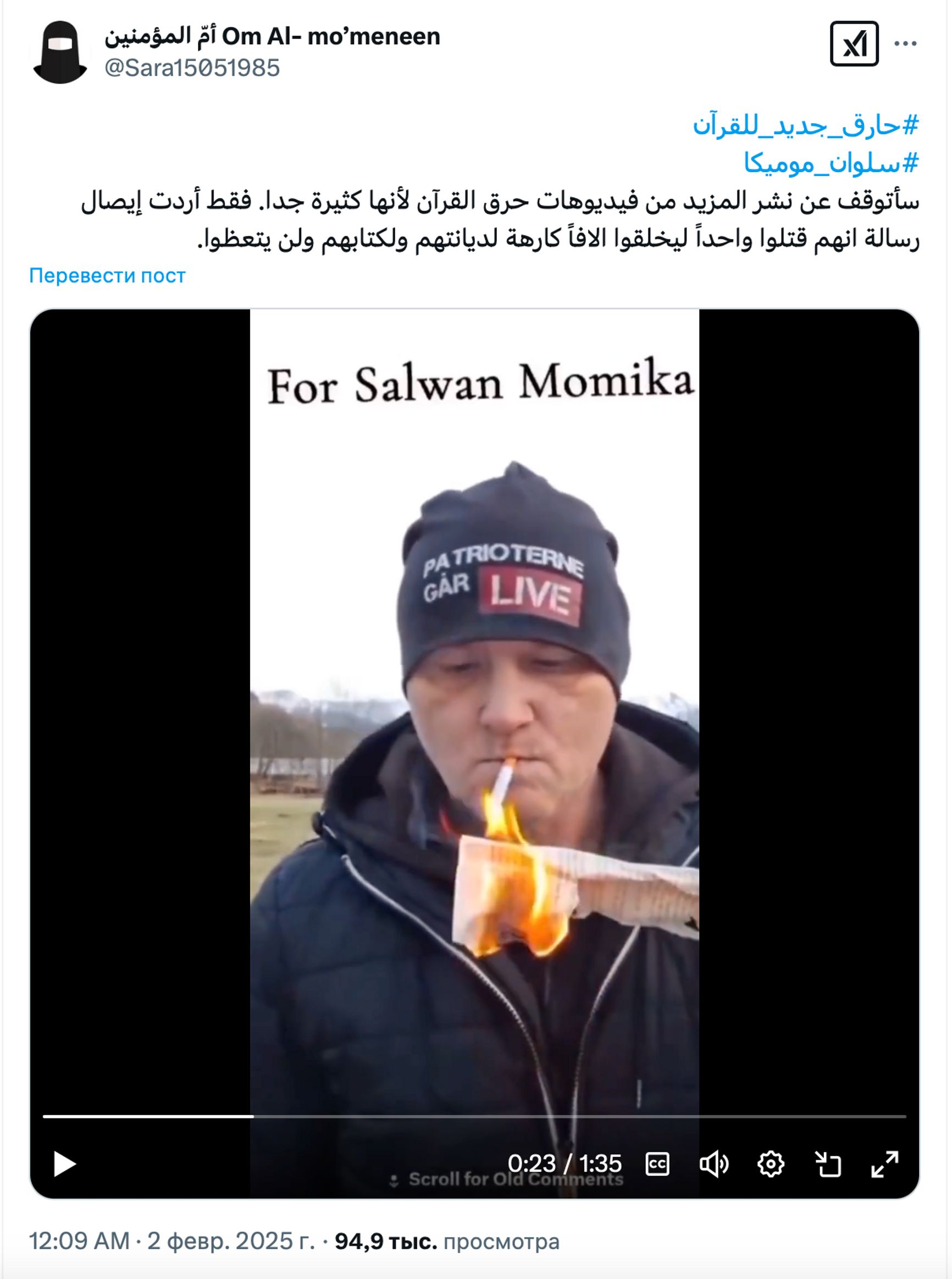 Лидер датской ультраправой партии «Жесткий курс» Расмус Палудан, ранее уже сжигавший публично Коран, 1 февраля провел новую акцию. Как сообщил политик в своем Twitter, он сжег книгу перед посольством Турции в Копенгагене. Британские СМИ сообщили, что 1 февраля в Манчестере был арестован 47-летний мужчина, который сжег Коран у памятника жертвам теракта, совершенного на стадионе в Манчестере в 2017 году.